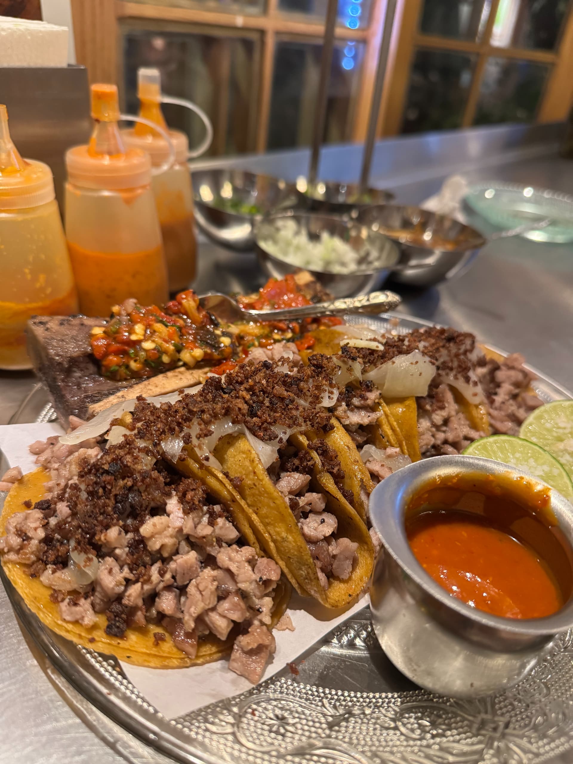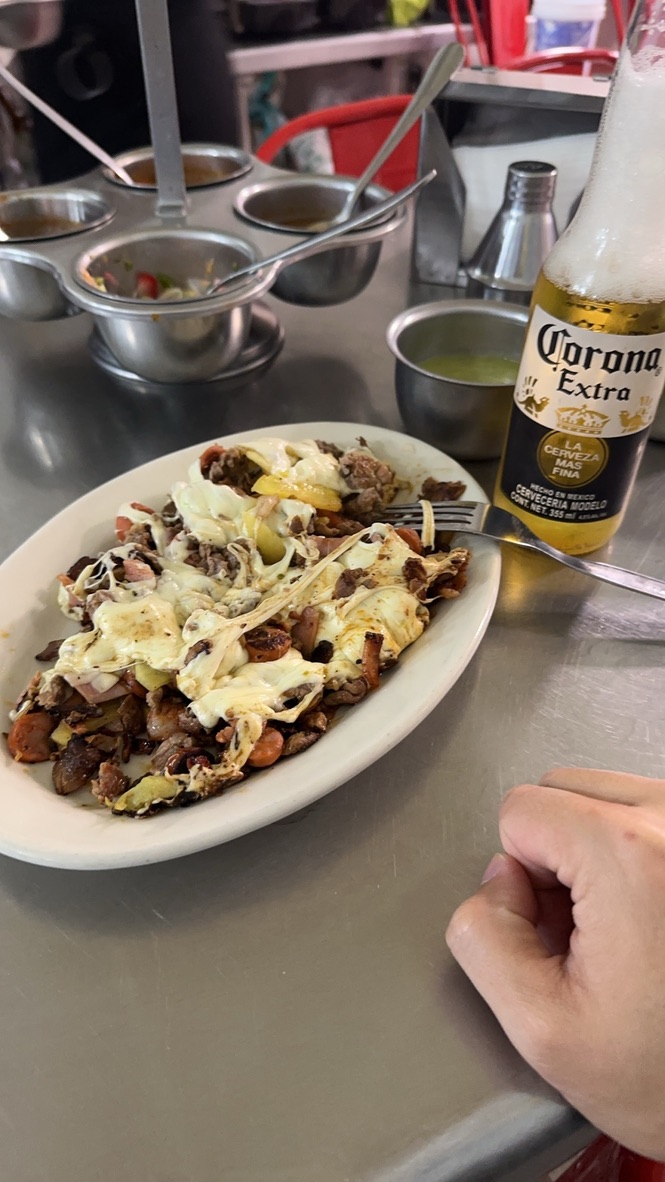 旅馆checkin后休息了一会儿就下楼去见识一下cdmx的夜生活。然而太累了所以就在楼下的小店简单吃了一些。期间依靠chatgpt给我翻译了菜单+一通比划,点菜很顺利没有什么难度。
