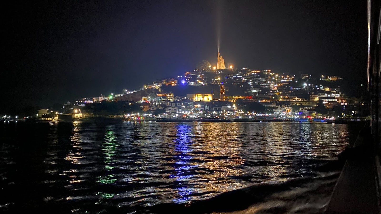 J岛夜景,图中的光柱是一个手持火把的雕像也是岛的最高点。