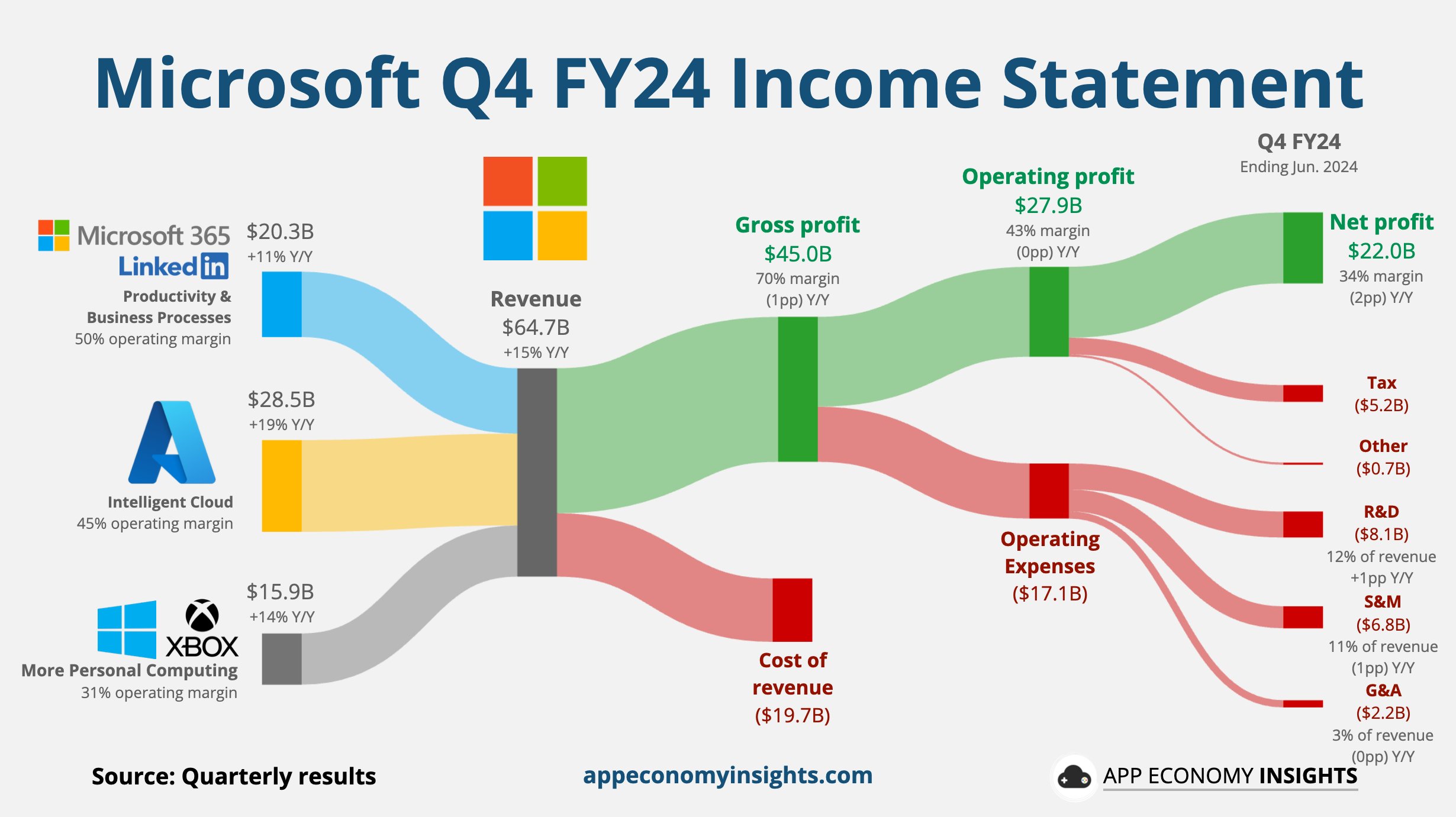 - Intelligent Cloud: This segment encompasses server products, cloud services like Azure, and enterprise services. It’s the largest revenue generator, accounting for $105 billion, which is 43% of the total revenue.
