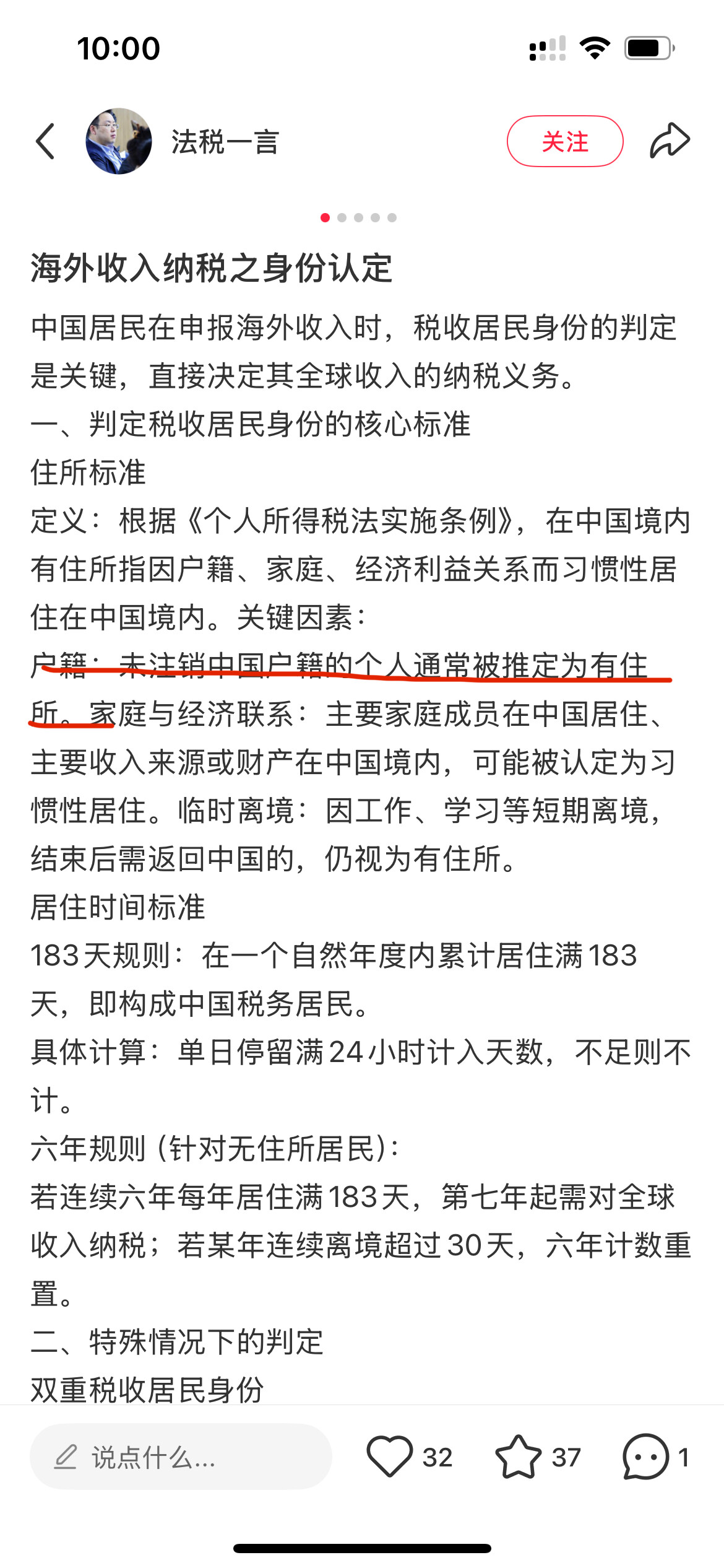 我的理解是,除了某些特定群体(比如只有护照而没有身份证的华侨),只要你有居民身份证->身份证就有住址这一行信息,就可以被认为有住址->就满足税务居民的条件了吧。