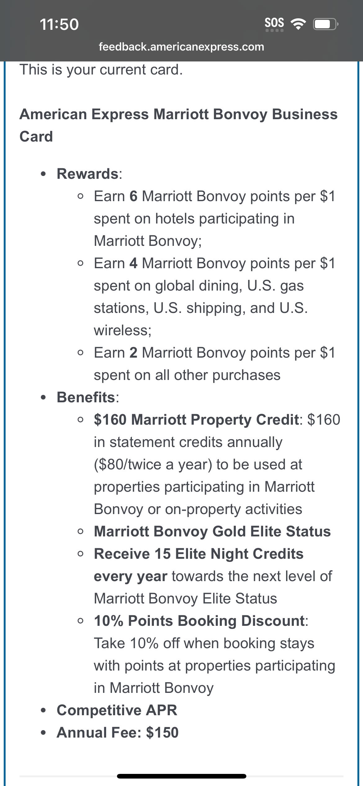 其中询问了关于万豪商业 possible refresh的feedback。感觉万豪在考虑不同tier的万豪商业卡了,可能的选项包括refresh biz marriott,以及新的biz marriott bevy和biz marriott brilliant。