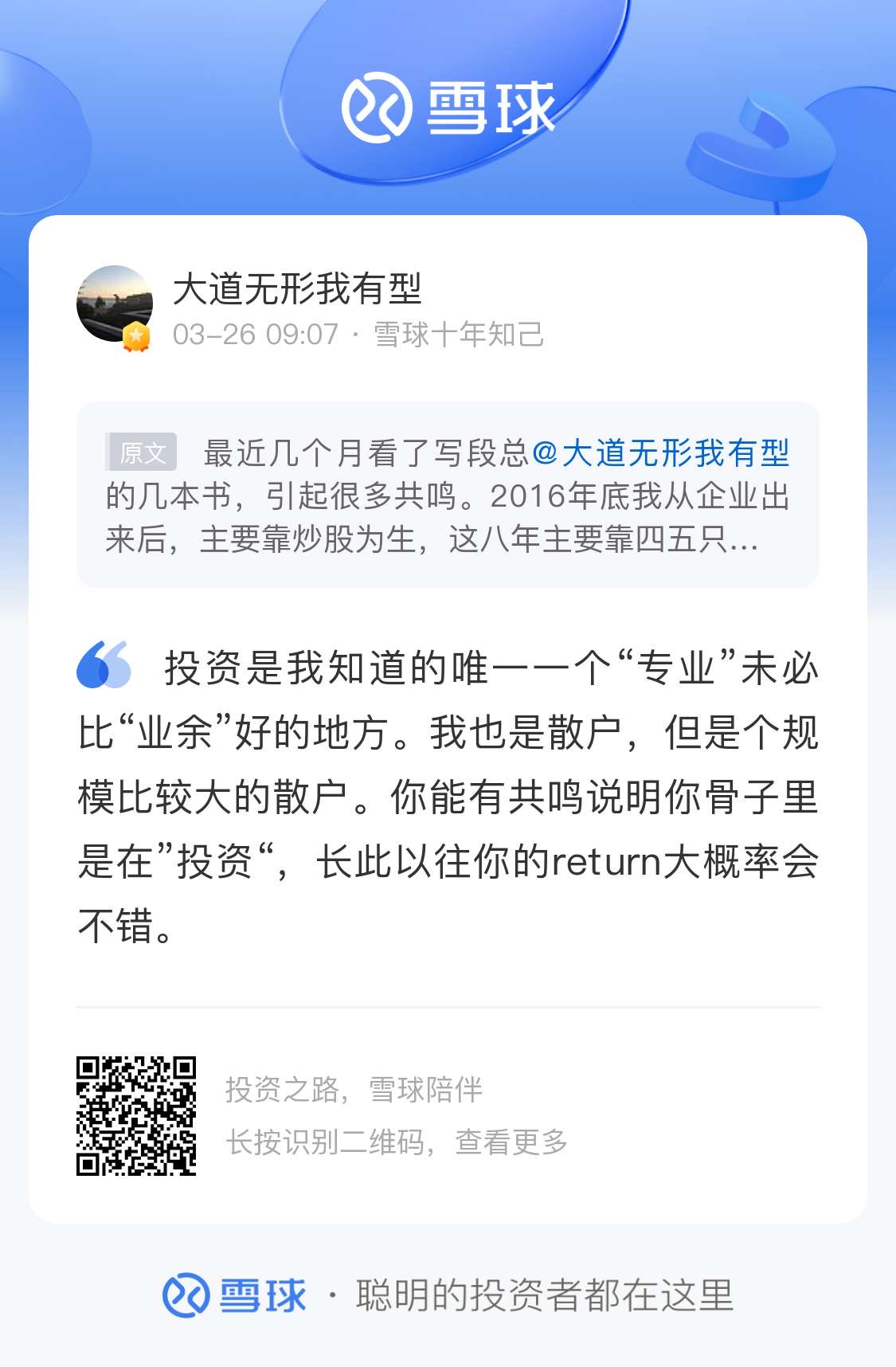 这个问题,我最近一直也在问自己。我回看了过去几年的投资,虽然大部分都是大盘,但是因为有个股的原因,也没有跑赢大盘。而且这些个股仓位带来的情绪波动确实很大。虽然投资的首要目标是获取收益,但投资过程的体验感觉也同样重要。我愈发觉得,从长期看,平均即卓越,为何总觉得自己能比大盘做得更好呢?感觉自己已经放弃了,虽然学了很久很久,就是单个方面的知识是学到了很多,但是并不影响依然看不懂公司和选不到好的股票。其实从另外一个角度想,如果光靠学习就能signifcantly beat the market,那这个能beat the market的人就会很多很多,那这个市场上的超额收益就会递减,导致绝大部分能beat the market的人会变得平庸。也就是说,beat the market的条件会变得越来越苛刻,剩下来的人会越来越少。