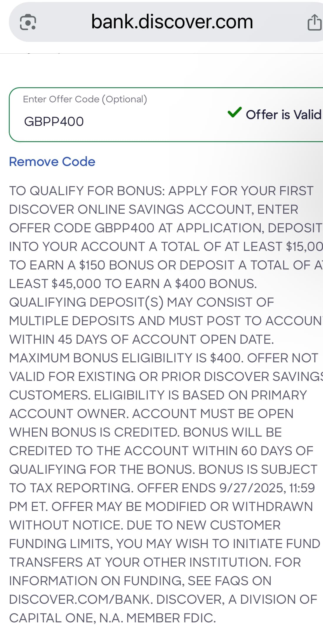 在谷歌隐身模式搜discover checking 400 第一个 sponsor的 官网给的code是GBPP400,我试了申请竟然还valid,9/27截止。该上吗?还是走普通的200 offer ![]()