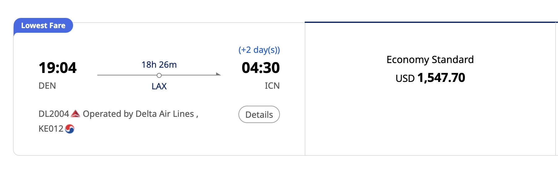 第一次是从VS上换了一张寒假42k的DEN-LAX-ICN达美大韩执飞,后来发现行李直挂不太方便(DEN这边是达美check-in),当时大韩官网这张票惊人的六千多刀,达美官网1547刀,其他一次中转最便宜也需要1200刀。第一次尝到了里程票的香。