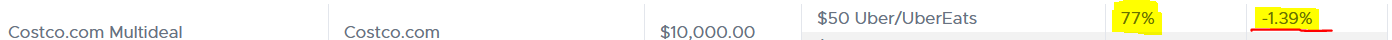 $80买uber $100 gc,Costco黑卡返2%,成本$80*98%=$78.4,卖给ai给$77,倒贴$1.4,没黑卡返现就倒贴$3!