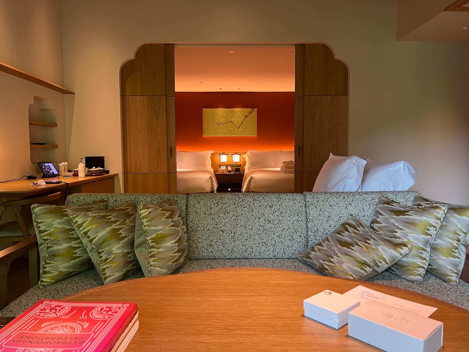 谈心过程:非周末,邮件加床(12xxx円)要升级,回复双卧套要房态。到前台后表示不能把两个房间合并成一个双卧套,最终给了一间角套并免去加床费