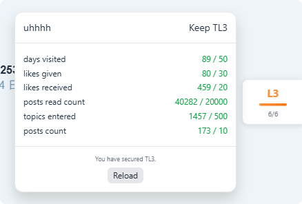 try this? 魔改了个论坛脚本,能看 TL(TrustLevel) 升级进度 !!仅供参考 实际还有一些暗坑 详见描述!! - #201,来自 哈屯oliver