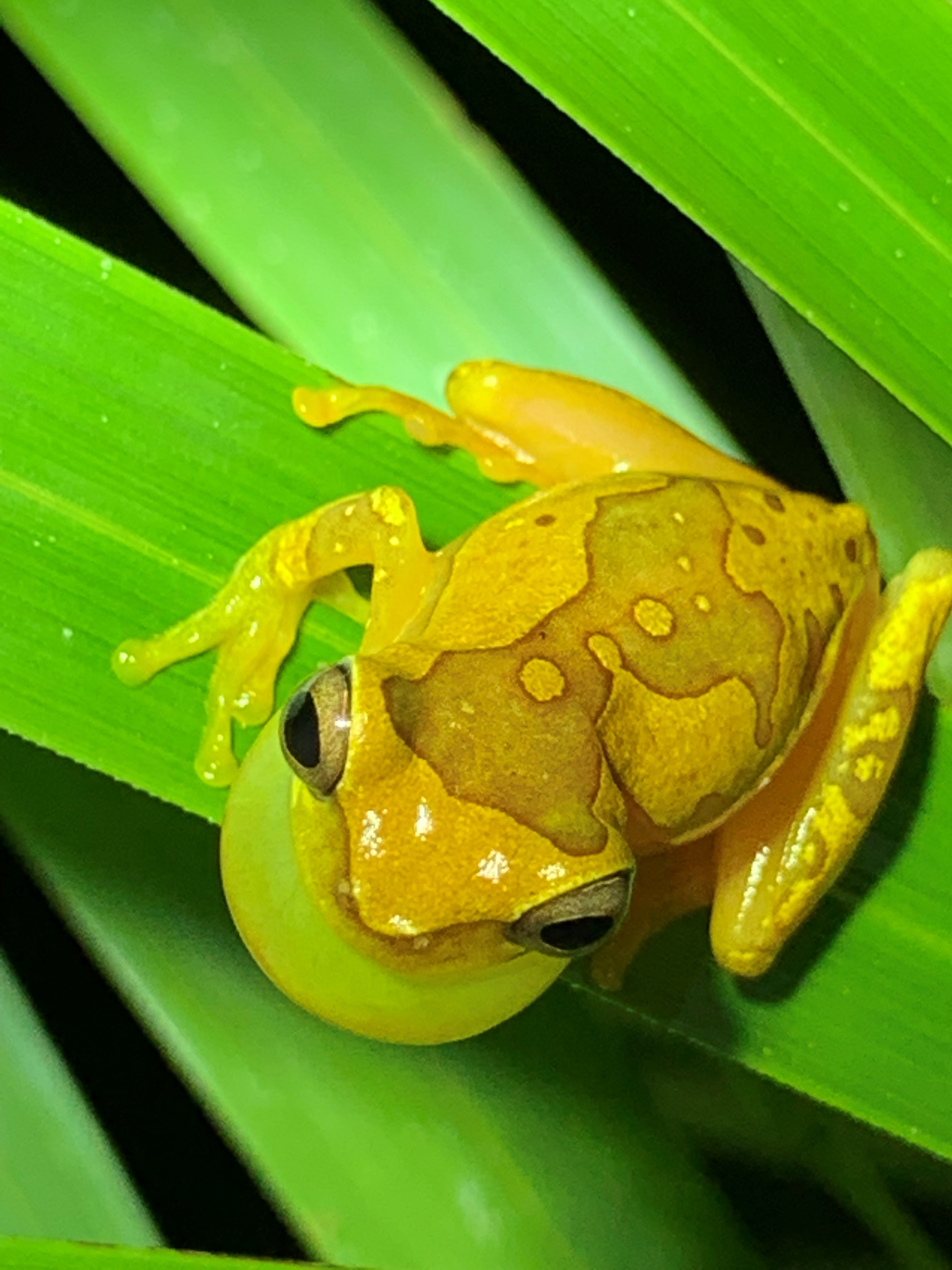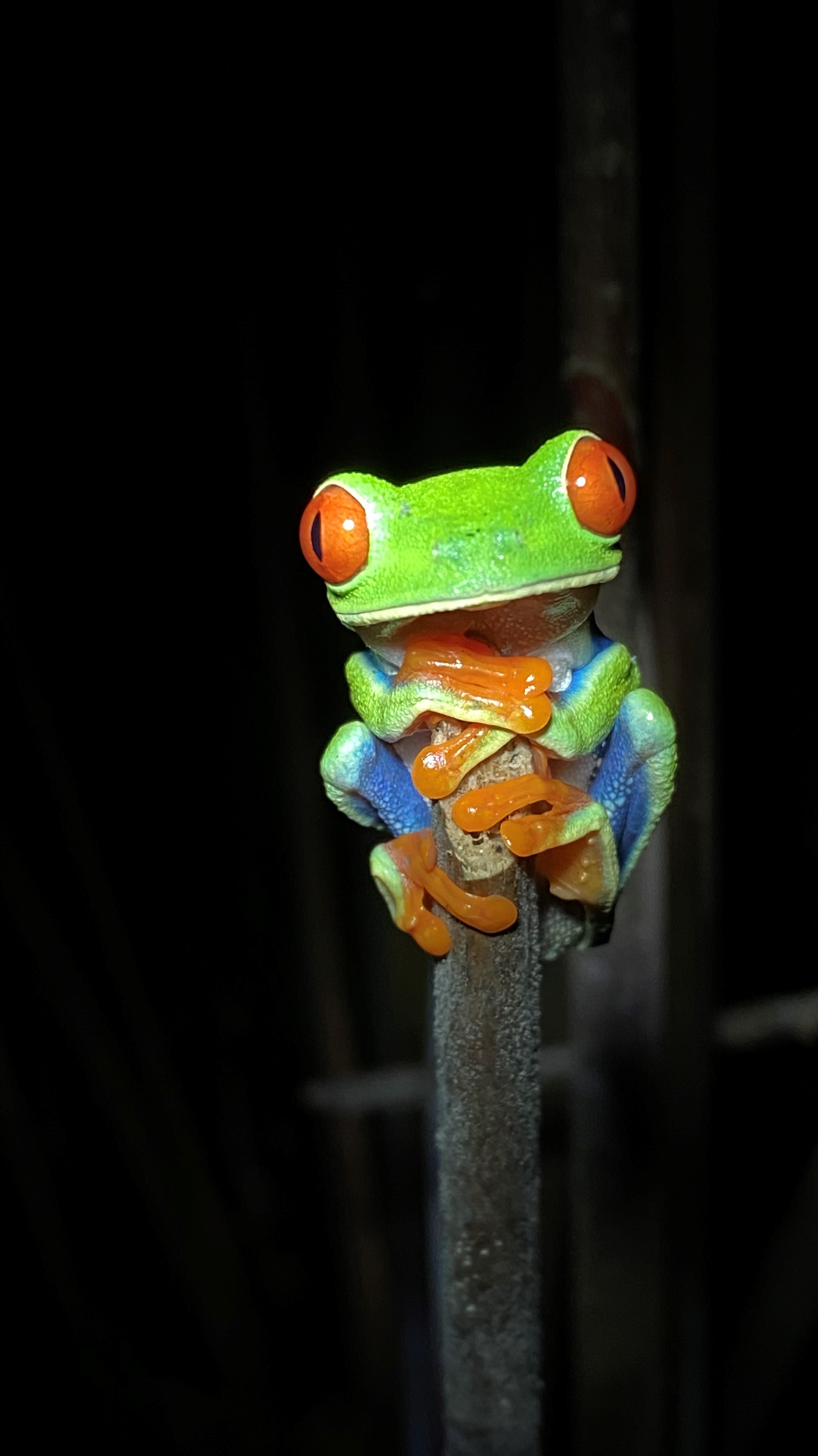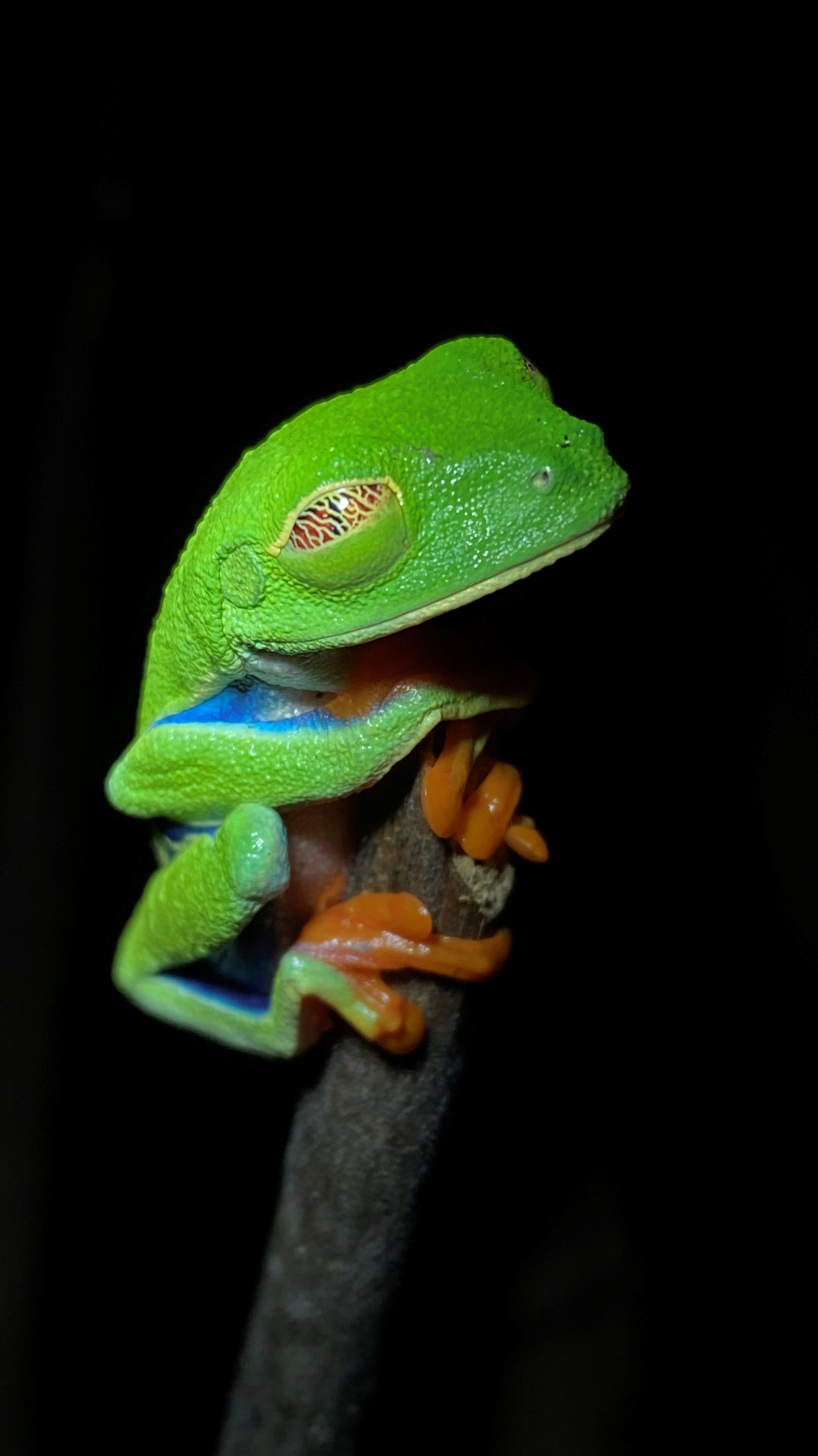手电打光了。你看青蛙的眼球,里面有一个白色的小亮点,呈圆形。