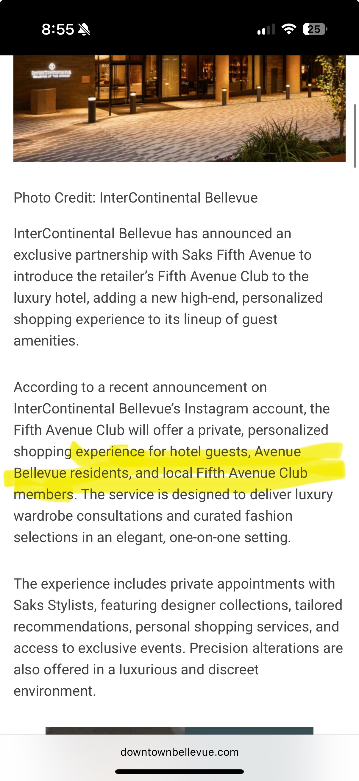 车可以停在隔壁Bellevue Square,店面在InterContinental里面,看到写着850的门就进去,跟前台说一下要去Saks,前台会打电话叫人下楼来接你坐电梯上去。