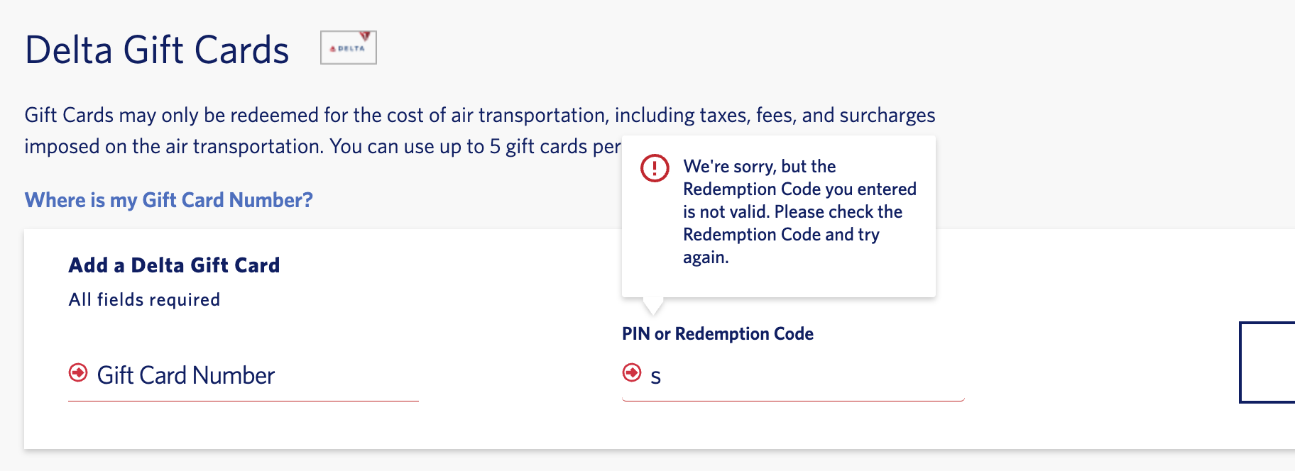 我一年多前在giftcard.com和达美官网各买了一张礼品卡,最近准备去买机票时,怎么也无法兑换啊,快哭了,官网只会显示图里的not valid,找了一圈找不到案例,各位有碰见过这种问题吗?