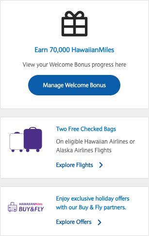 The Hawaiian Airlines® World Elite Mastercard® primary cardmember is eligible to receive 2 free checked bags on Hawaiian Airlines and Alaska Airlines operated flights. The primary cardmember must book the Hawaiian Airlines and Alaska Airlines operated flights on their Hawaiian Airlines® World Elite Mastercard® to receive the two free checked bags. Authorized users of the primary cardmembers’ Card Account do not qualify for the free checked bag benefit. On Hawaiian Airlines, this is only for travel between North America and Hawaii and between Neighbor Islands (interisland). International flights are excluded. On Alaska Airlines, the cardholder free bag benefit cannot be combined with other free baggage allowances.