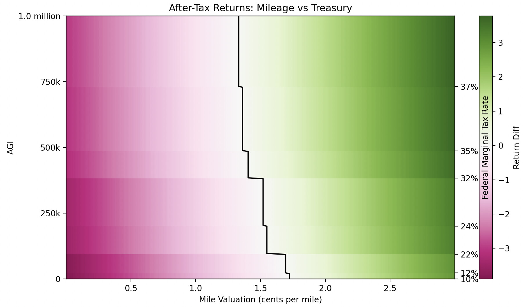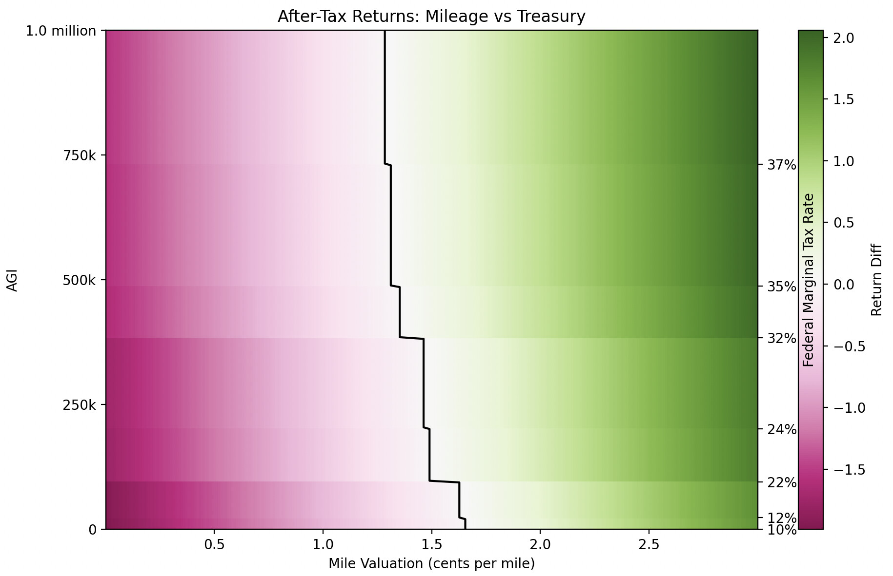 表面上看里程估值达不到1.8cpp的时候存钱是亏的,但是考虑税后收益是更赚的。和对应的国债利率进行比较,可以得出不同税率和里程cpp估值下的税后break even曲线。举个例子,按Bask Bank最新的活动利率2.26%(2% + 10k miles for $75k 180 days)对比最近的短期国债4.22%,考虑不同AGI对应的marginal联邦税率,可以画出这样的税后收益对比图: