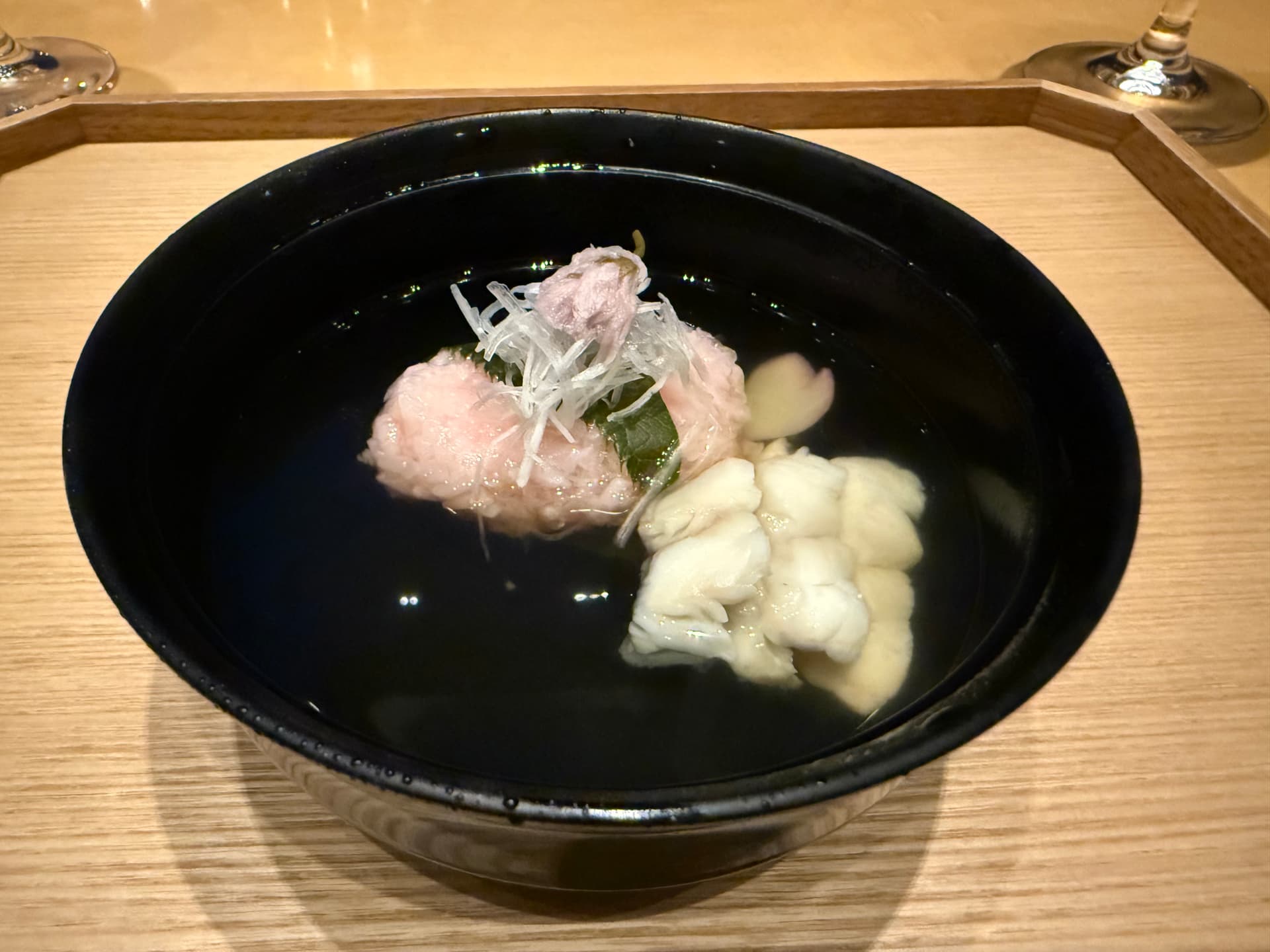 樱花口味的mochi和鲜鱼清汤。很味道很清甜。感觉吃过的每家omakase都有这道菜。