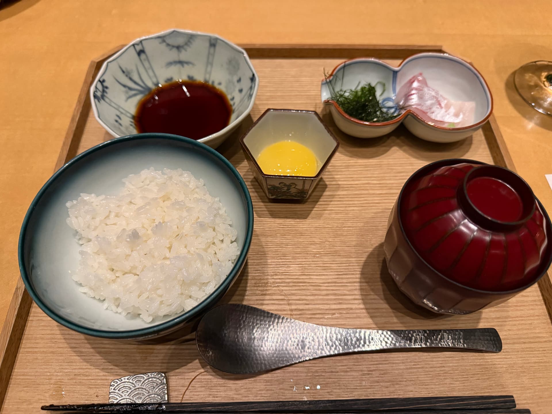 濑户内海几乎所有旅馆都有的鲷鱼饭。配菜有一个蛋黄+几片鲷鱼生鱼片,配上鲷鱼高汤。中规中矩的味道。