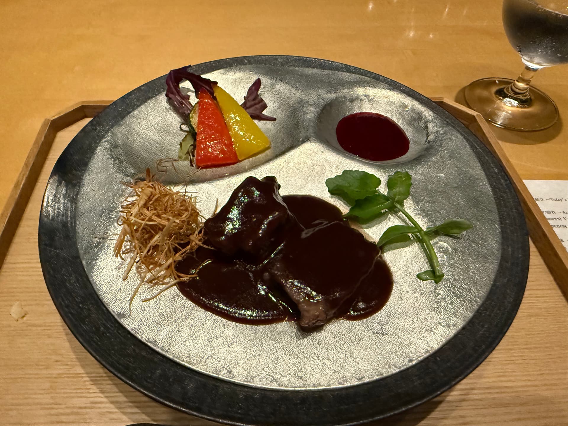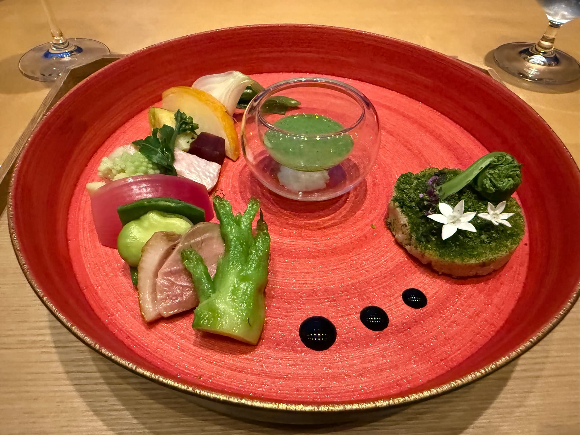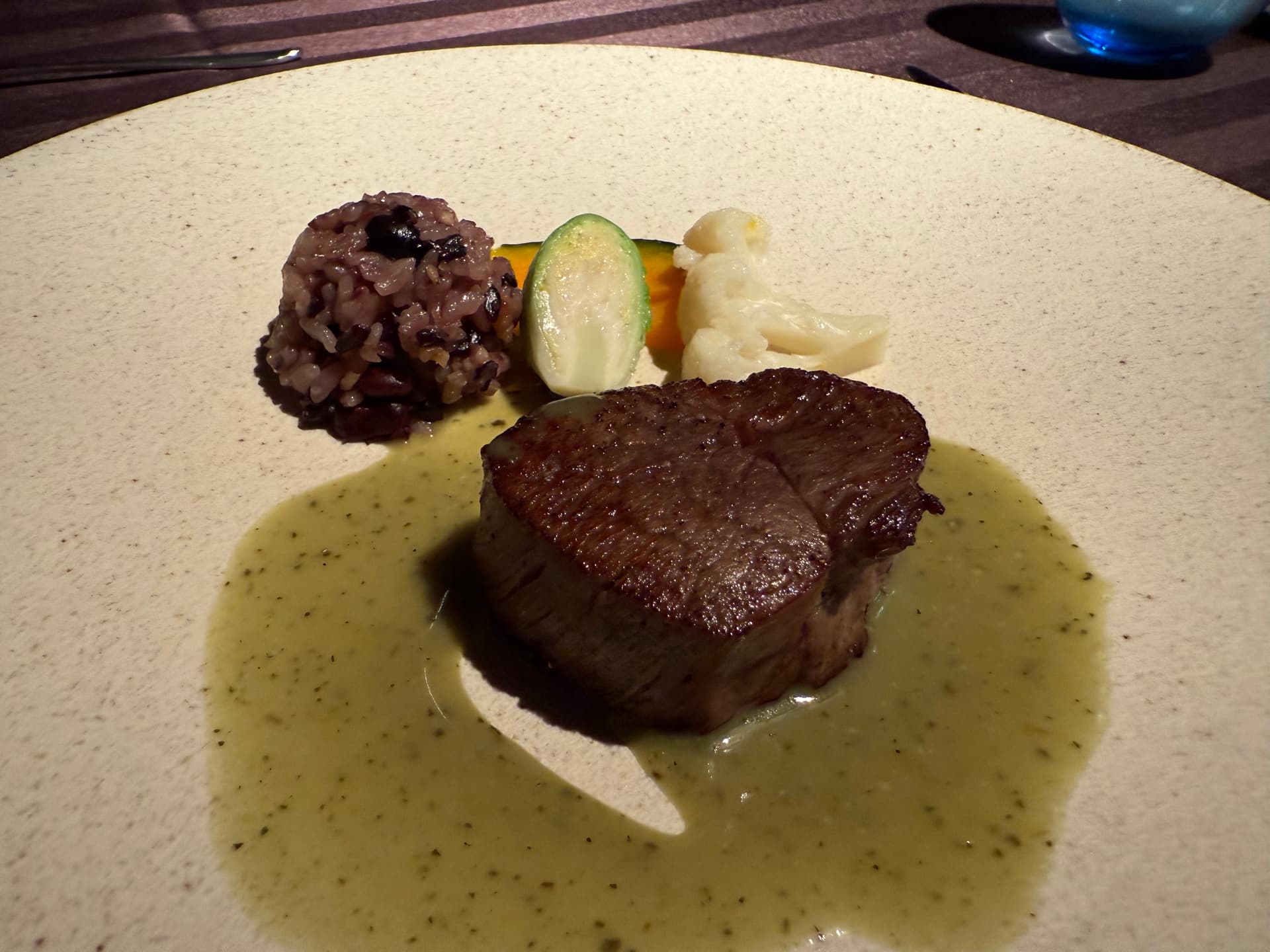 当地新鲜蔬菜配上味增系的酱汁和鹅肝酱。好吃。