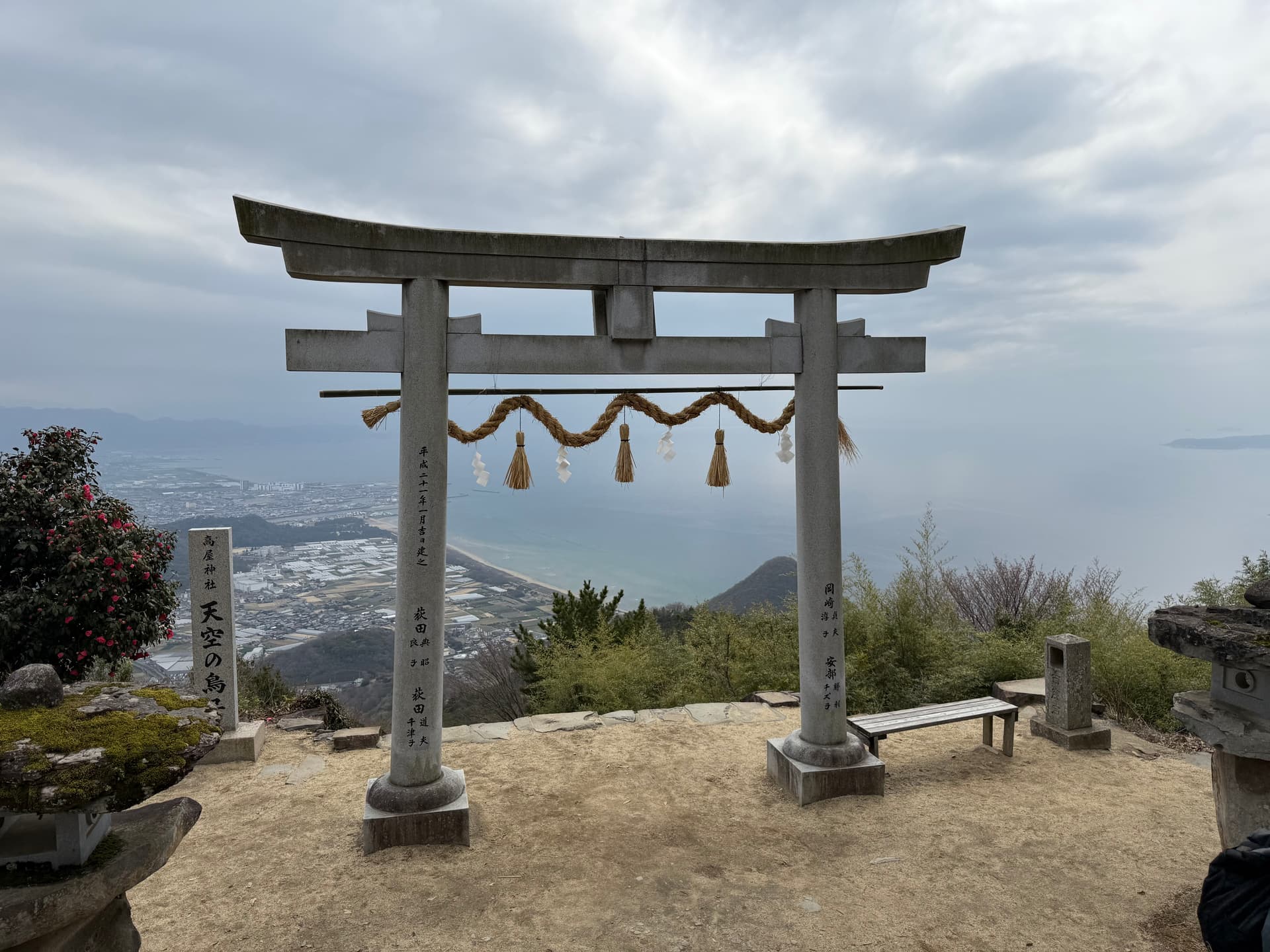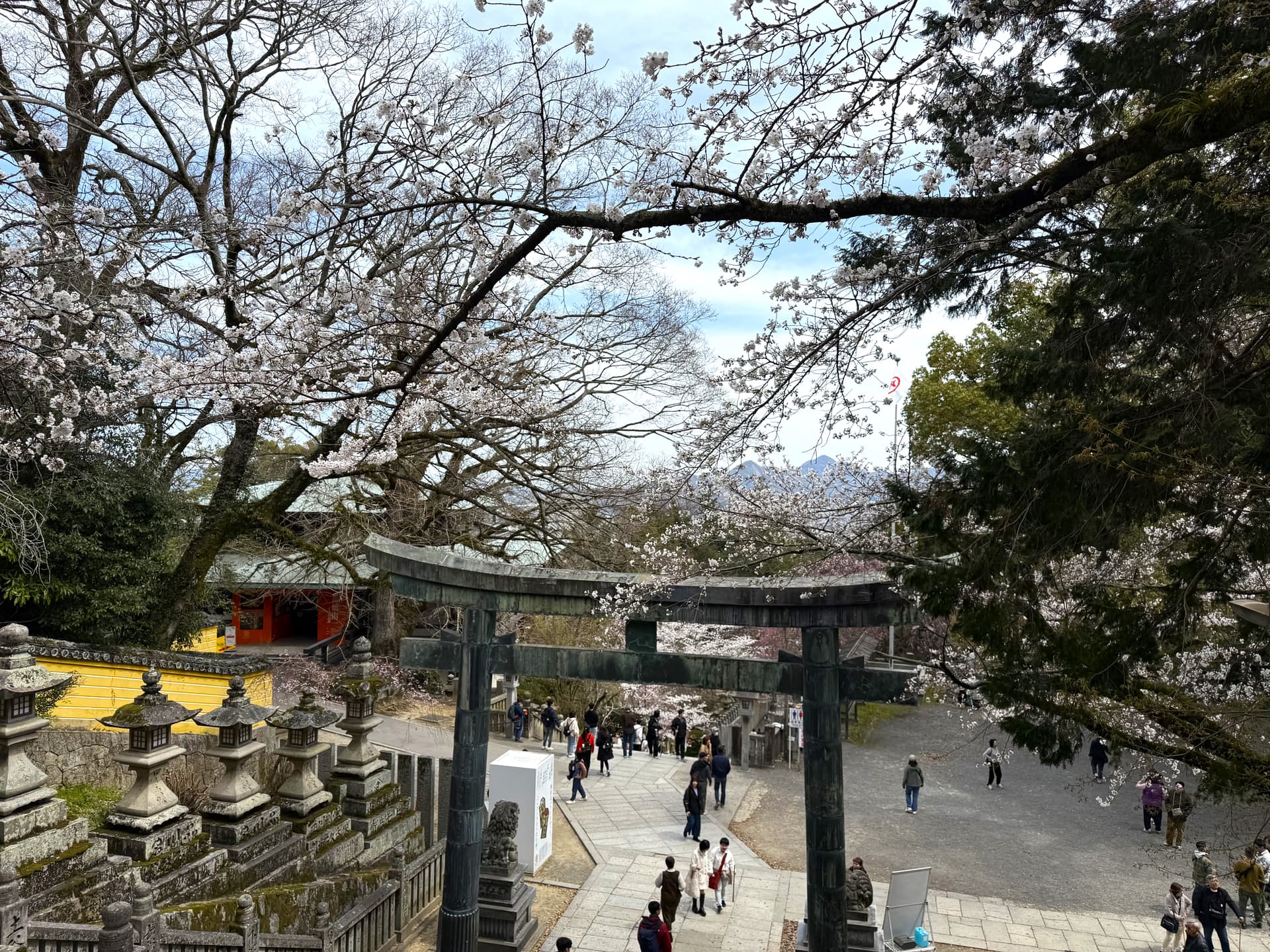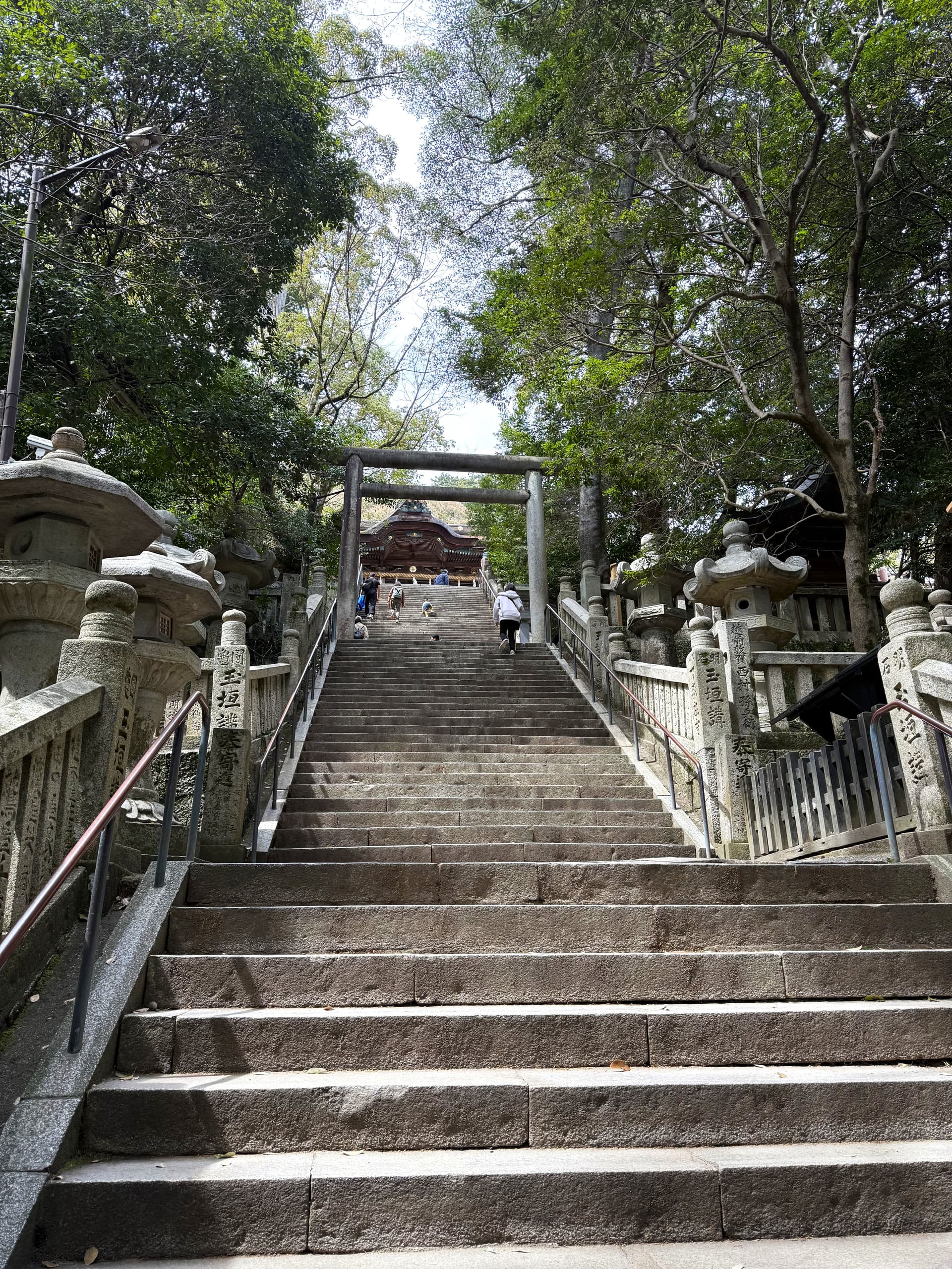 酒店checkout之后就往高松开了。顺路去了一下高屋神社的天空鸟居和善通寺。高屋神社有两种玩法,一种是从山下一路爬270节台阶,另外一种是开车到山顶的停车场。因为租了车,所以我们选择了更轻松的第二种方案。不过山上的路是单线公路,每走几分钟就要极限会车,经常需要一排车倒车后退。