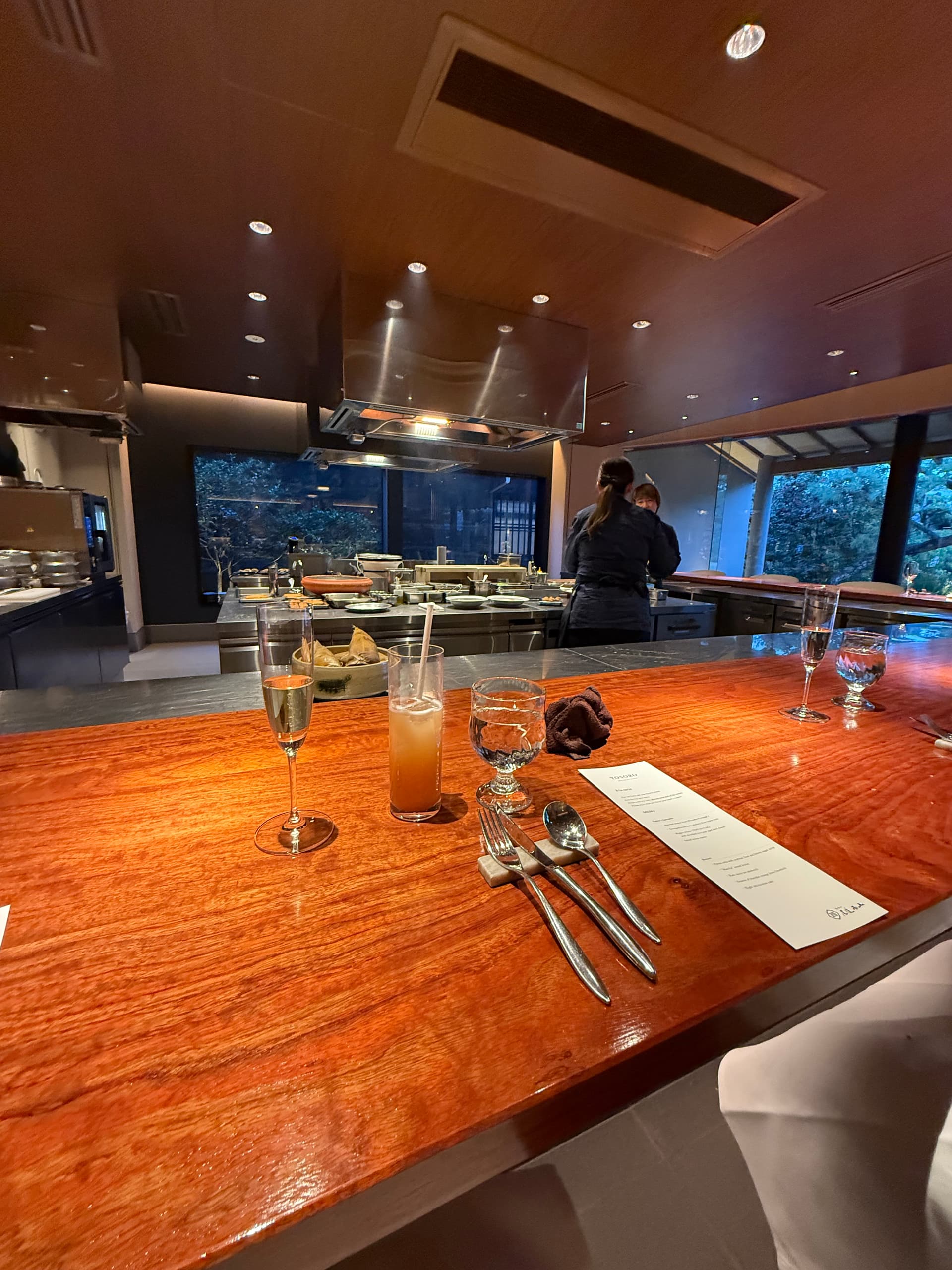 这次预定的是一泊两食计划。晚餐是日法融合菜,食材都是当地特色。餐厅吧台正对着一个人工瀑布,晚上灯一开还有点情调。每桌都是单独指派一个服务员。