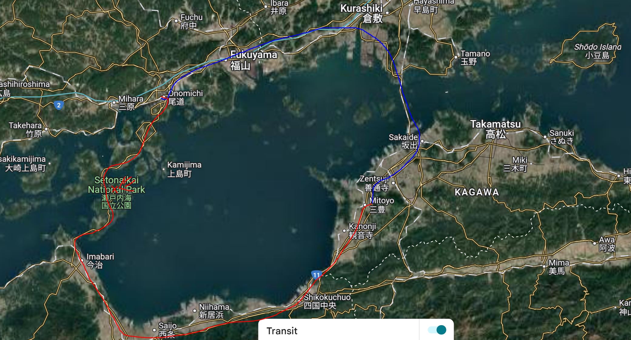 原本的计划是从琴平经由瀬戸大橋返回尾道(蓝色路线)。不过查了下手机, 发现岛波海道那边的开山公园樱花接近7,8分了,于是绕路选择了红色路线去看樱花。虽然多花了近1小时,但是非常之值得。