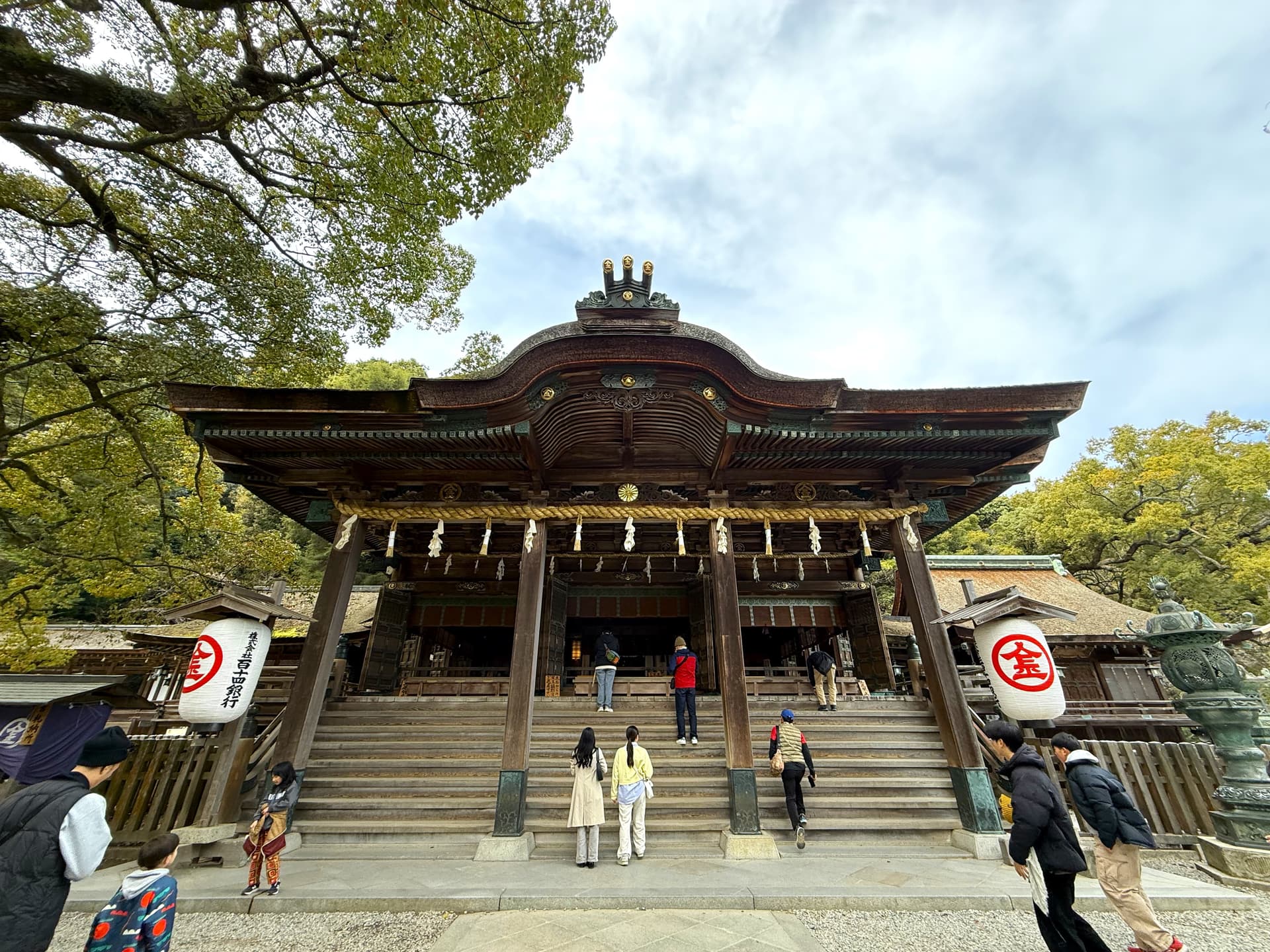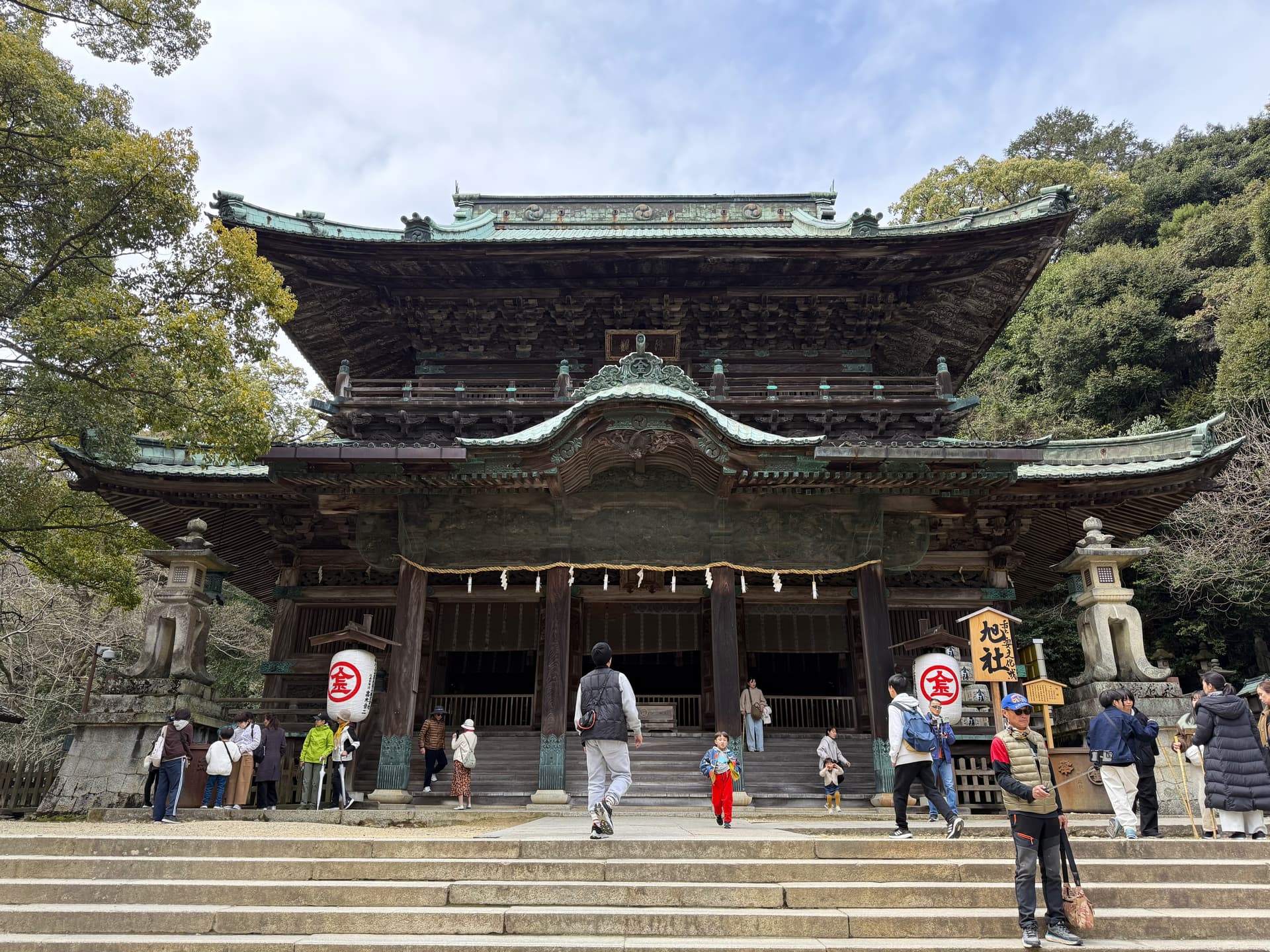 早早checkout酒店之后就直奔金刀比罗宫。这家名子里带金,据说可以守护财运。正常的参拜需要爬785节台阶上山,不过我们这次用了作弊码。接近山顶的后山有一家叫神椿的餐厅,可以直接开车上山,之后再爬100多节台阶就到本宫了。不过上山的路非常难开,路窄坡陡,中间还被谷歌地图坑到一个V字型的超窄弯道,最后只能乖乖绕路上山。
