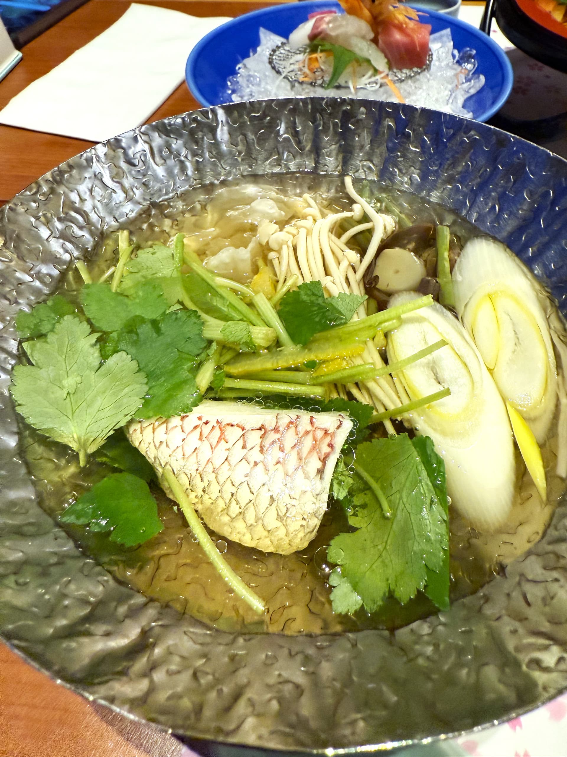 早餐是鲷鱼涮涮锅。先吃生鱼片再涮着吃,最后吃汤泡饭,很合胃口。