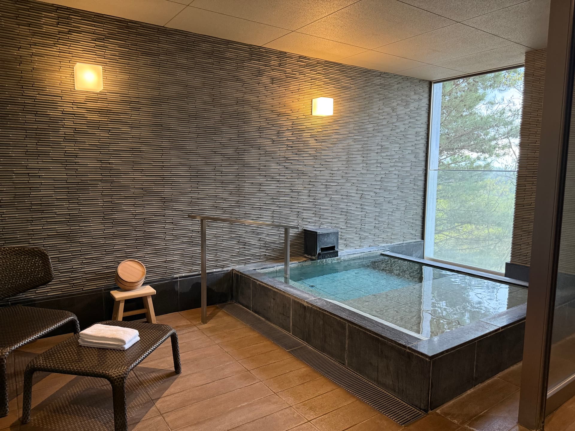 窗外就是几颗樱花树,可惜才刚刚开花。屋内的forest view温泉很棒,还可以躺下泡。酒店还贴心的提供了当地特色的饮料,啤酒还有零食。一边泡一边喝简直太爽了。