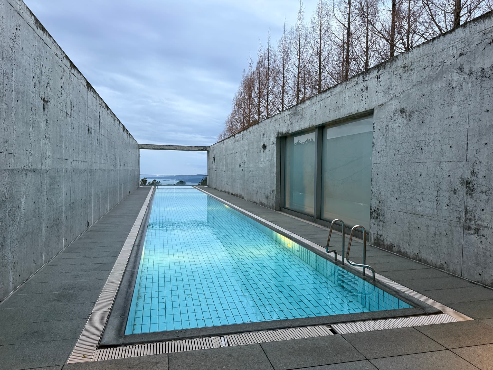 酒店特色之一的超长无边大泳池。远处可以隐约看到濑户内海的小岛。