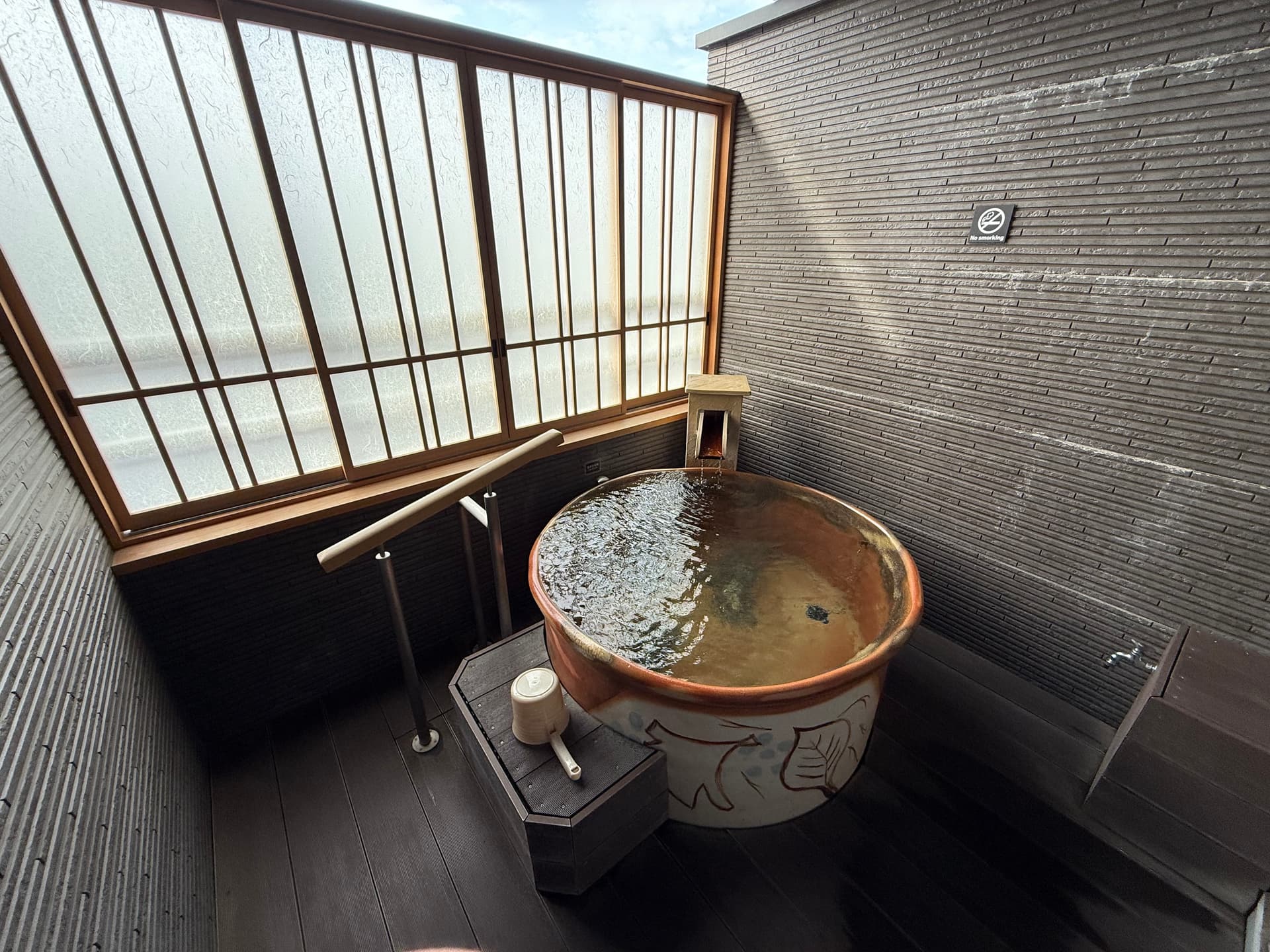 当地烧制的陶瓷浴缸。温泉是源流直挂,水温很高。