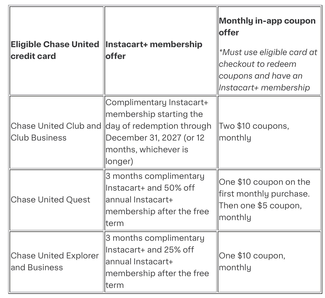 Instacart ()的福利主要分布在Chase 的三种不同系列的信用卡上, 几乎包含了大部分的Chase 信用卡, 但是不含CSR, CSP, Freedom 等UR 系列卡(Chase 最早在CSR/CSP/CF 提供的类似福利已经于2024年过期), 这次送的福利从5/1/2025起, 到12/31/2027截止。