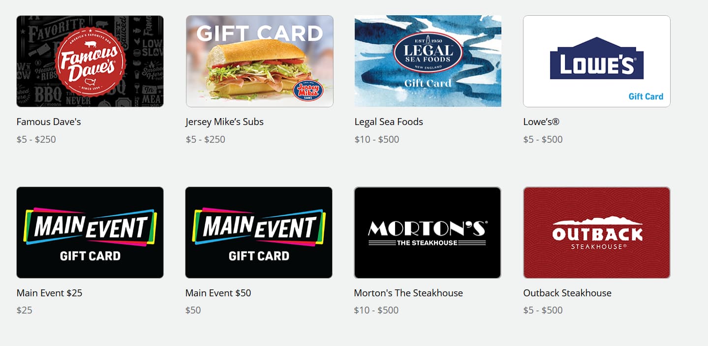 Baja Fresh / Belk / Bloomingdale’s / Bob Evan’s / Build A Bear / California Pizza Kitchen / Cracker Barrel / Door Dash / Famous Dave’s / Jersy Mike’s / Legal Sea Food / Lowe’s / Main Event / Morton’s Steakhouse / Outback / Panera / Petsmart / P.F. Chang’s / Regal / Red Lobster / Top Golf / Staples / Ulta / Under Armour / XBox