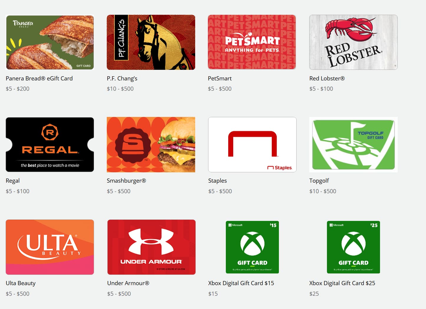 Adidas / AMC Theatres / Barnes & Noble / Blimpie / Build-A-Bear Workshop / The Children’s Place / Chuck E. Cheese / Cold Stone Creamery / Dave & Buster’s / Domino’s / Fanatics / Foot Locker / GameStop / Gap Options (Gap / Athleta / Banana Republic / Old Navy) / IHOP / Jamba / Main Event / Michaels / Nexon / Panera / Pinkberry / Fandango at Home / and Xbox.