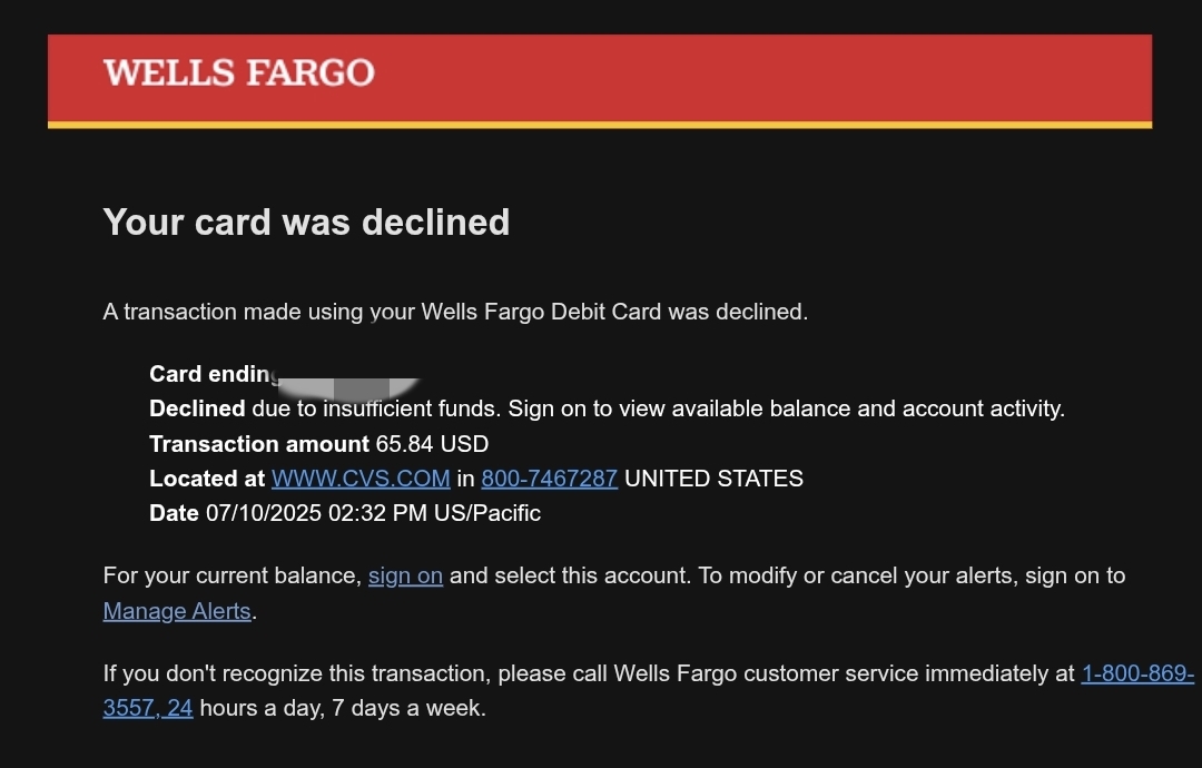 lz为了薅400的开卡羊毛,上个月刚开了WF的checking,收到debit card之后,激活了一直扔抽屉里,今天忽然收到一封邮件,提示余额不足导致交易取消,甚至不是因为盗刷被拒的