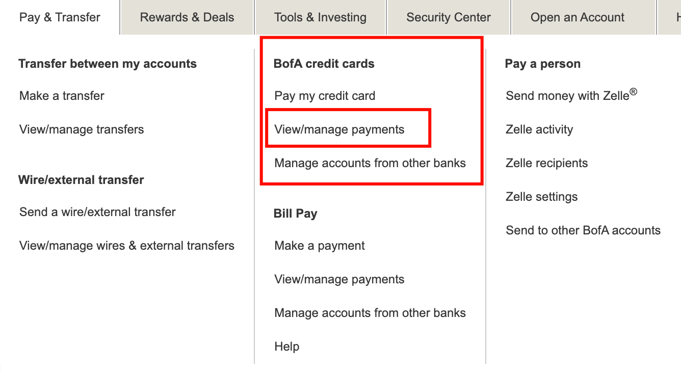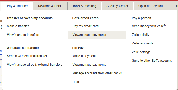 我这是这样的,可能是因为我并没有在 BOA 添加外部银行(我是用其他银行来 pull 或者 push BOA 的),点 View/manage payments跳到的是