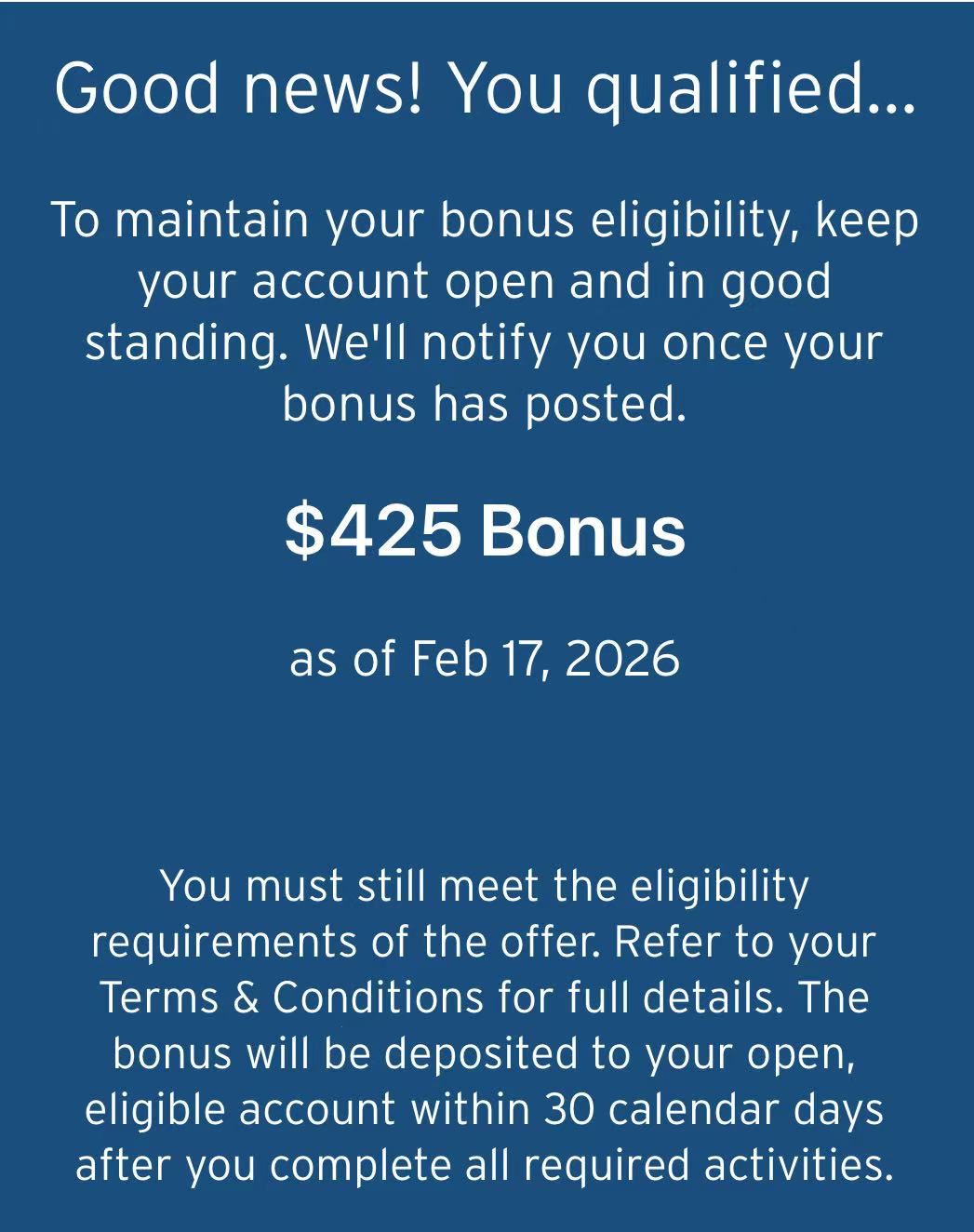 来更新DP:刚在这里求助潭友一天后就收到了$425的bonus,transaction显示“Interest Adj Q4 2025 EDD Tiered Offer”,看来从开户到bonus posted等100天左右是正常的。