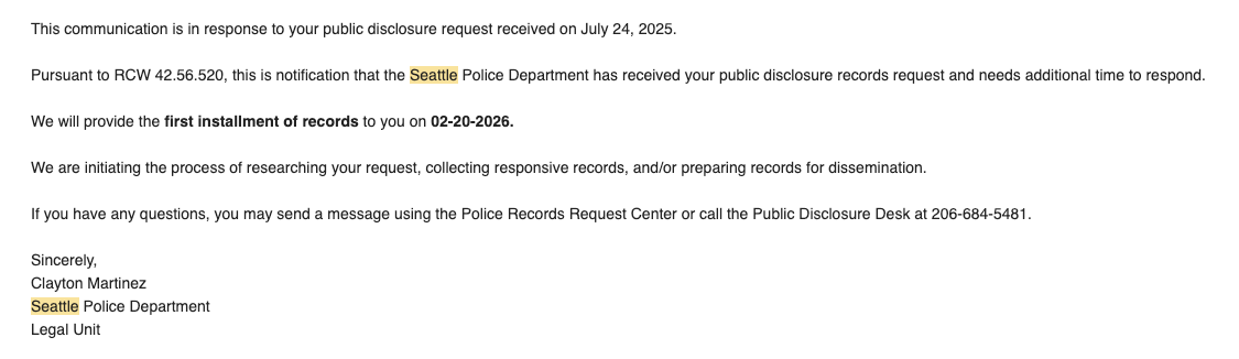 我向西雅图警局申请的信息公开,公开逮捕和初步审讯视频。 SPD回复说,backlog太多,2026年2月20日之前才会提供给我。到时有了以后我会发出来。
