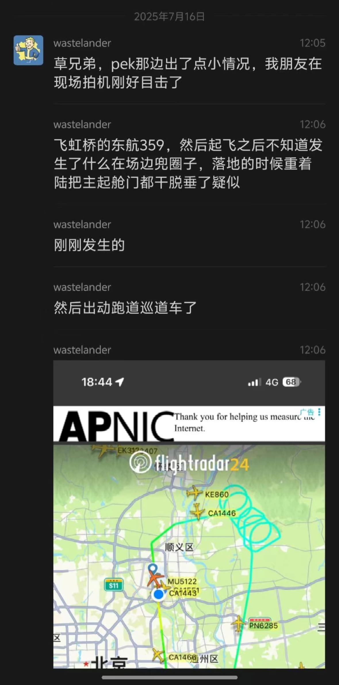 2025年7月16日下午18:43,中国东方航空 MU5122 执飞空客350-900(注册号B-32D0)因起飞后起落架舱门故障,经平谷山区放油后取消前往上海返航北京首都机场