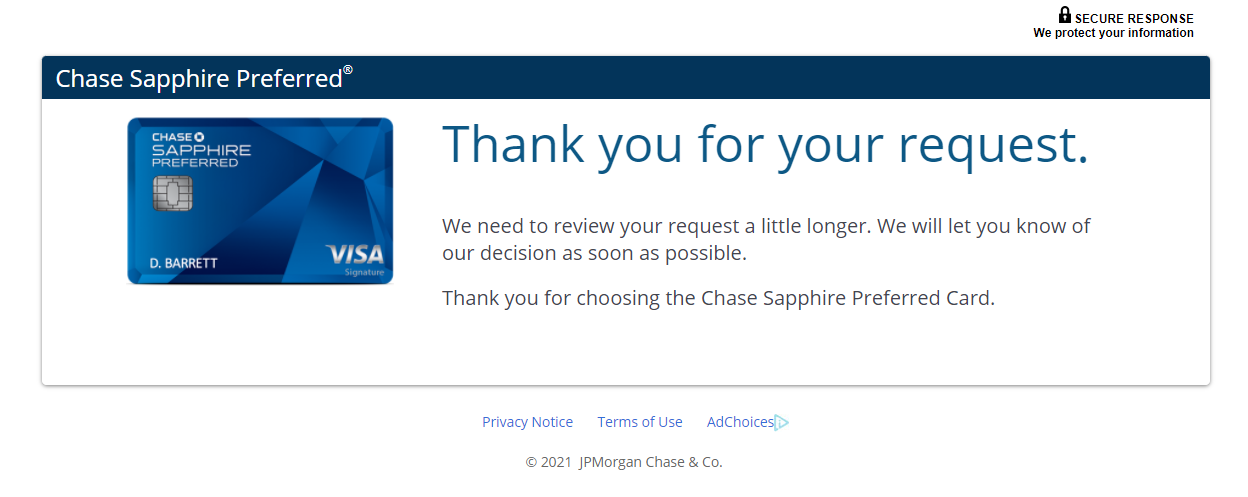 30天内尽量不要申请大于2张Chase的卡,否则很大概率被拒。