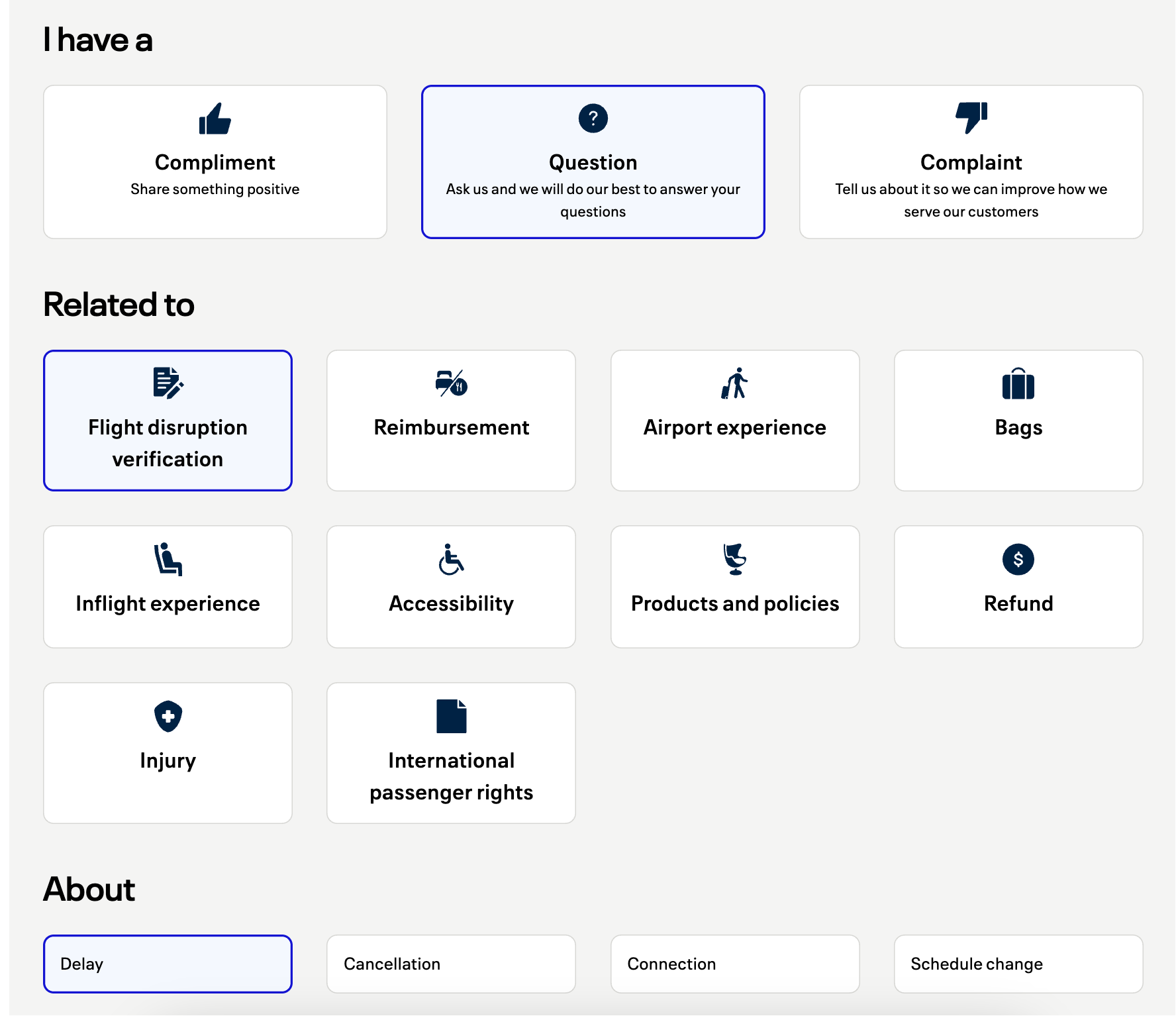 对于飞机延误索赔,都需要一个航空公司出具的责任声明,到底是机械故障,天气原因还是什么因素?这些信息一般来讲的话不会直接发给乘客,需要自己主动去要,比如说以UA为例,要到这里选择I have a question,然后在选项里挑Flight disruption verification,再在底下选择Cancellation或者Delay