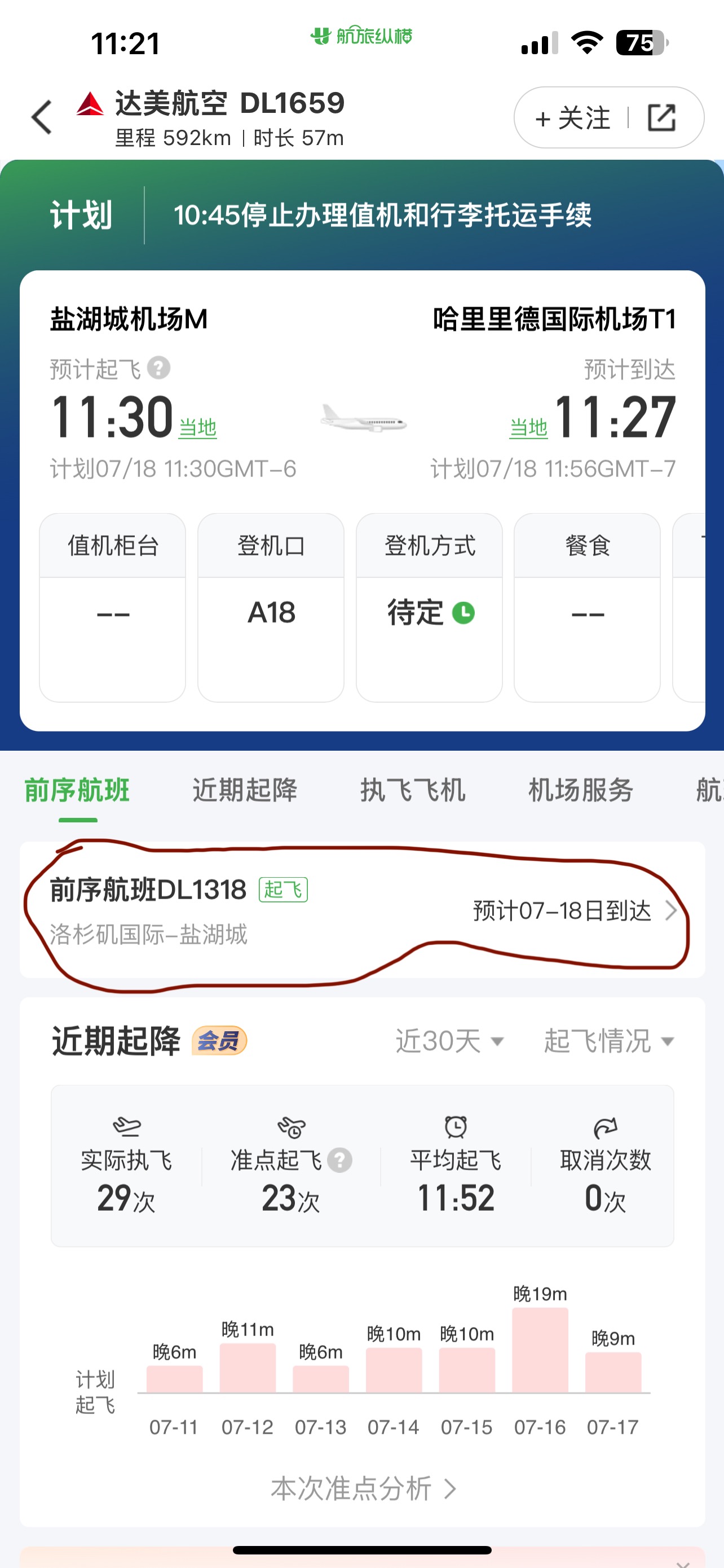预定航班的时候其实就可以有一个基础概念,像我身处中部荒村野岭,附近也只有一个区域性机场,航班数量很少,固定几班直达周围的大机场,去美国绝大多数地方都要转机。所有的飞机都是早上先从大机场飞过来这个小机场,然后再飞回大机场。因此如果前面的航班遇到各种问题延误了,后面一连串的飞机都会受影响。在此推荐几个能查前序航班的软件。Flighty,查看前序航班是收费功能。不过我记得我刚注册的时候,此功能也是开放的,估计是免费试用一回吧。我推荐一个国内的APP,“航旅纵横”,美区也能下得到。此功能免费而且不需要实名认证就能搜,非常方便。如图所示,搜索DL 1659,可以看到详情