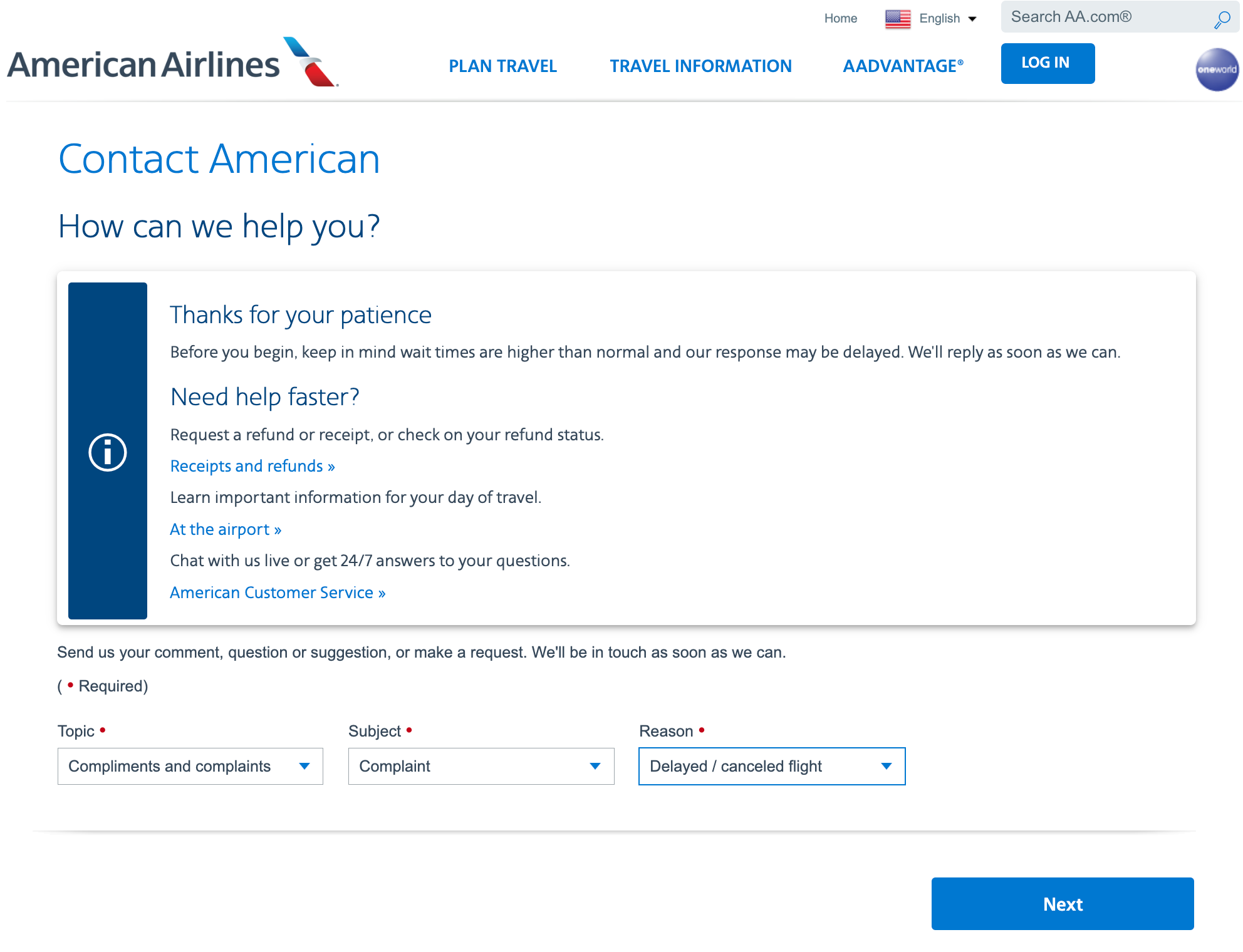 American Airline: https://www.aa.com/contact/forms?topic=#