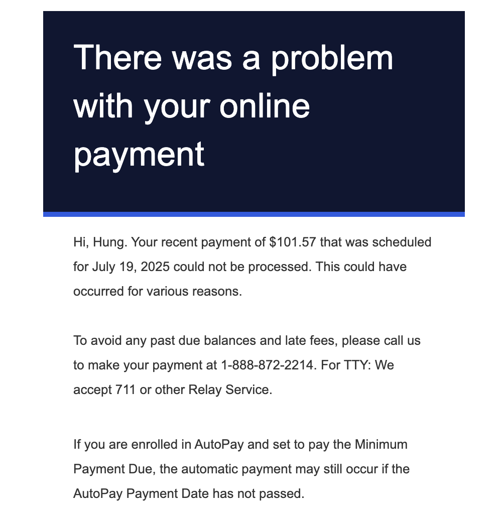 今天早上收到一封Citi的信說我的付款有問題 但是我昨天沒有任何的付款 我的Balance也是0 我的App裡也沒看到任何問題 請問有人有遇過嗎 這樣我該打客服嗎? 因為上次打客服為了驗證身份等了一週的 Physical mail 所以有點不敢打客服了
