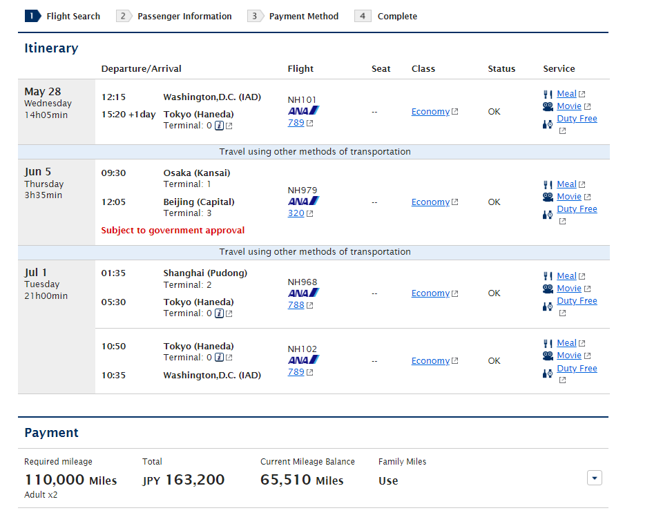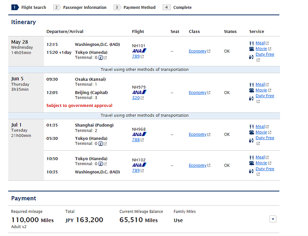 使用Amex MR兑换的ANA经济舱,提前半年定的行程,55k per person,一共刷了110k,另外交税刷掉1000美刀左右(不要问我为什么税这么贵,只能说旺季同期的机票全都是3k+刀)