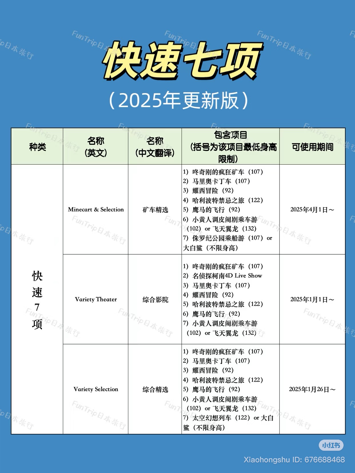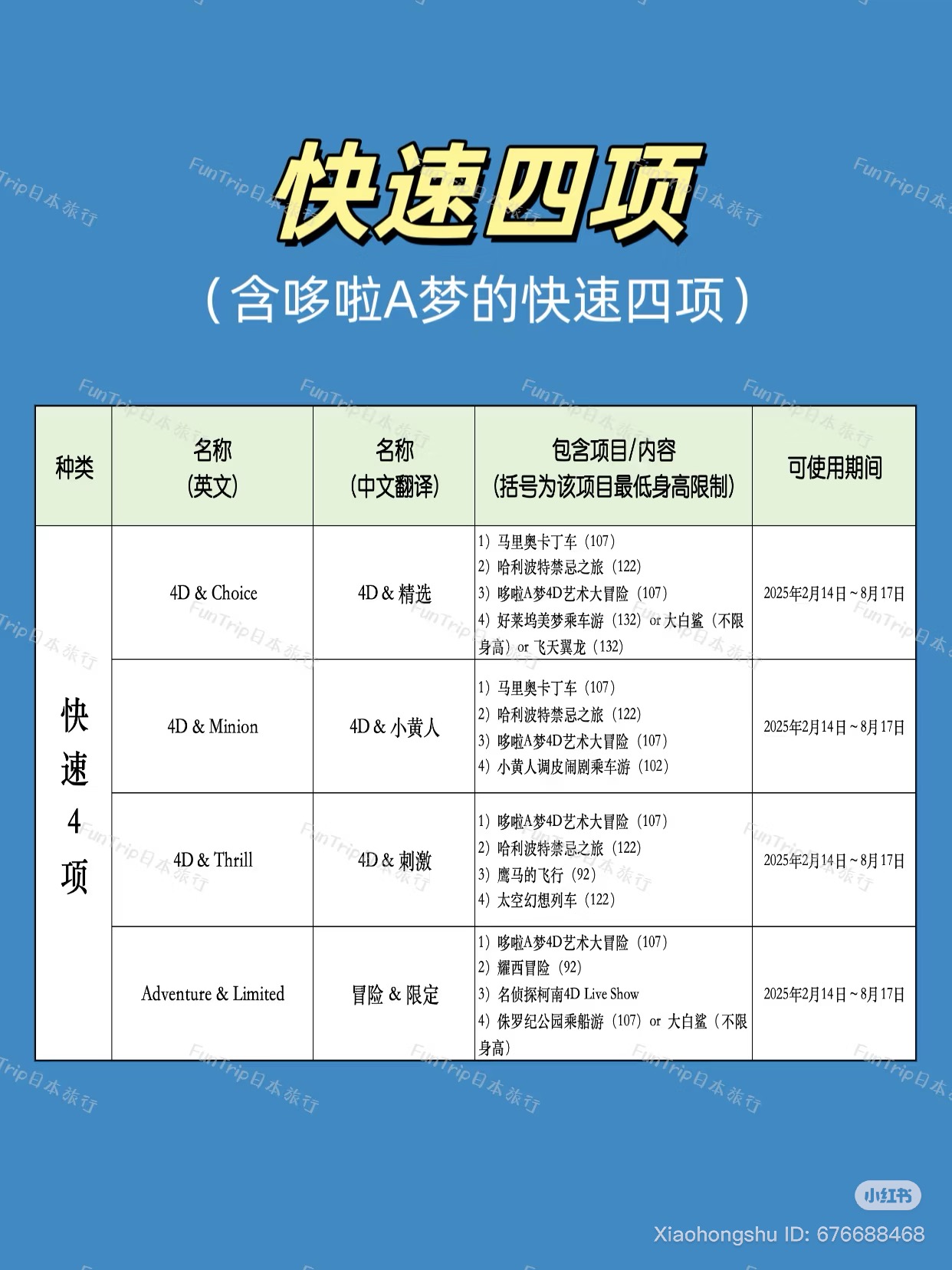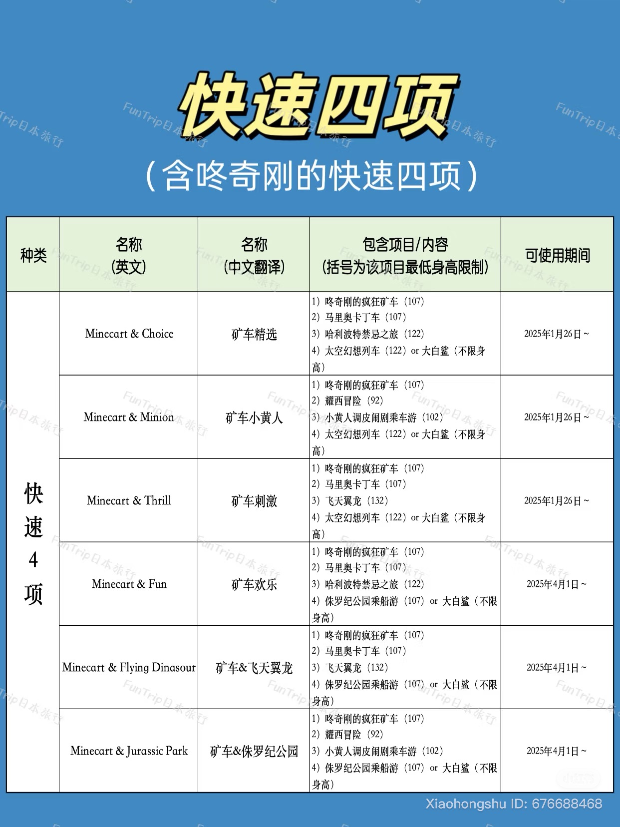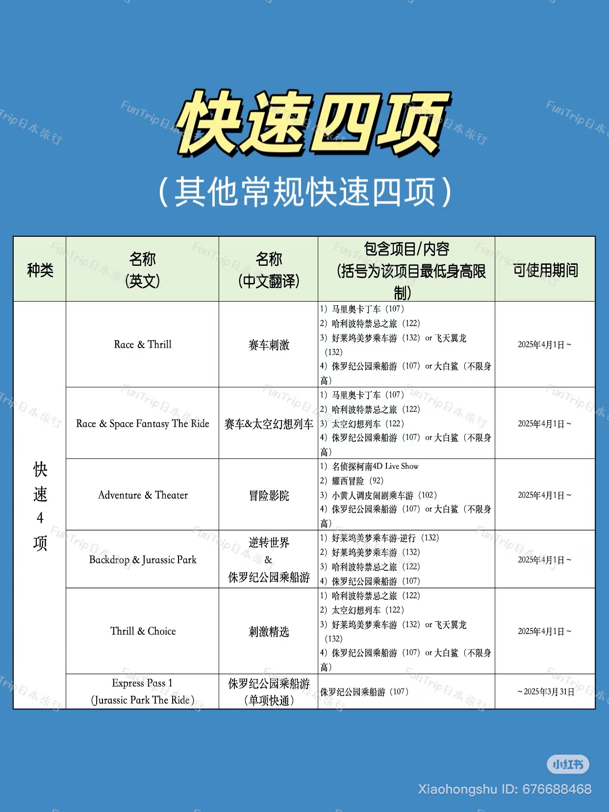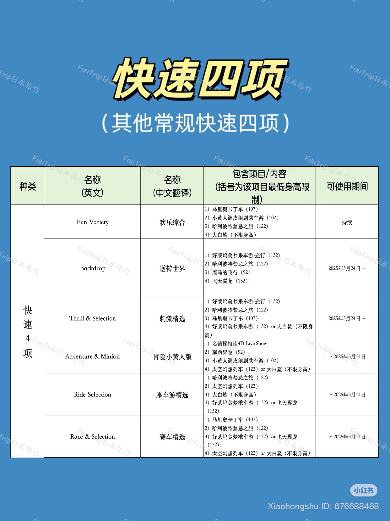 - 速通券上会写明项目和时间,请尽量在所标注的时间内去排队玩。例如哈利波特鹰马飞行 10:00 am - 10:30 am,你就应该不早于9:45am并不晚于10:45am去排队,至于什么时候坐上去不要紧,反正一定要排上队就是了。