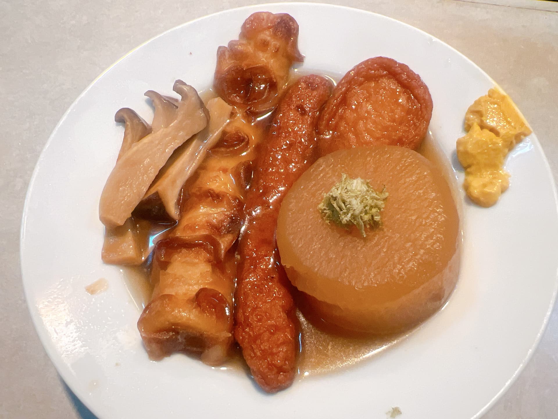 一家安静的小店,晚上几乎没有人。开店的是一个不懂英文的老太太,好在关东煮点菜不需要语言,比划比划就行了。这家关东煮的味道并不浓厚,清淡的酱油味道浸润在各种食材之间,蘸上黄芥末酱,颇有回味。价格不贵,人均1-2k JPY,品类因时而异,常驻的菜品可能只有萝卜,嫩豆腐,豆腐皮和铁板烧牛肉。安静温馨的小店氛围让人着迷,一杯麒麟一番榨或许是最好的陪衬。