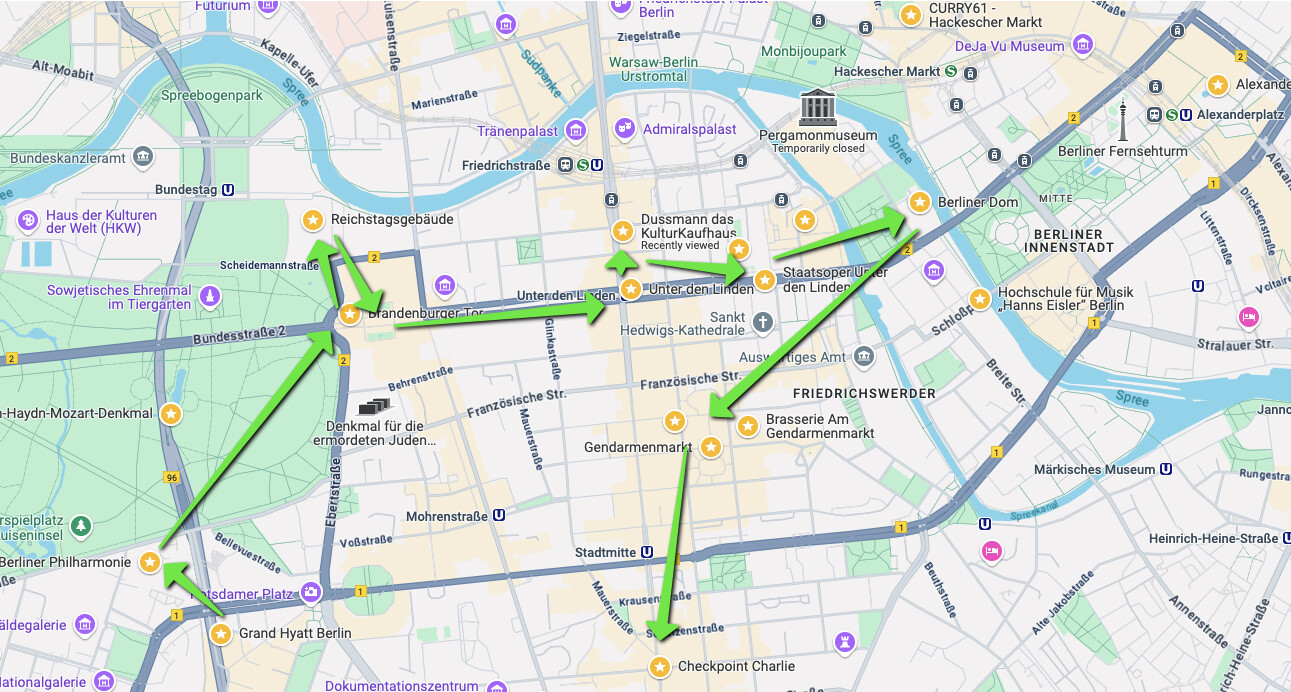 先展示一下我们当时的路线,大概需要走一天,看完最后一个景点便可以找个地方吃饭然后回酒店: