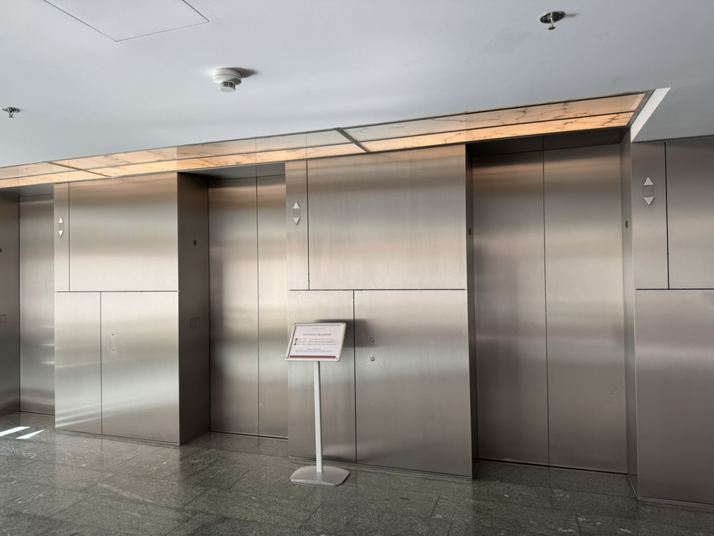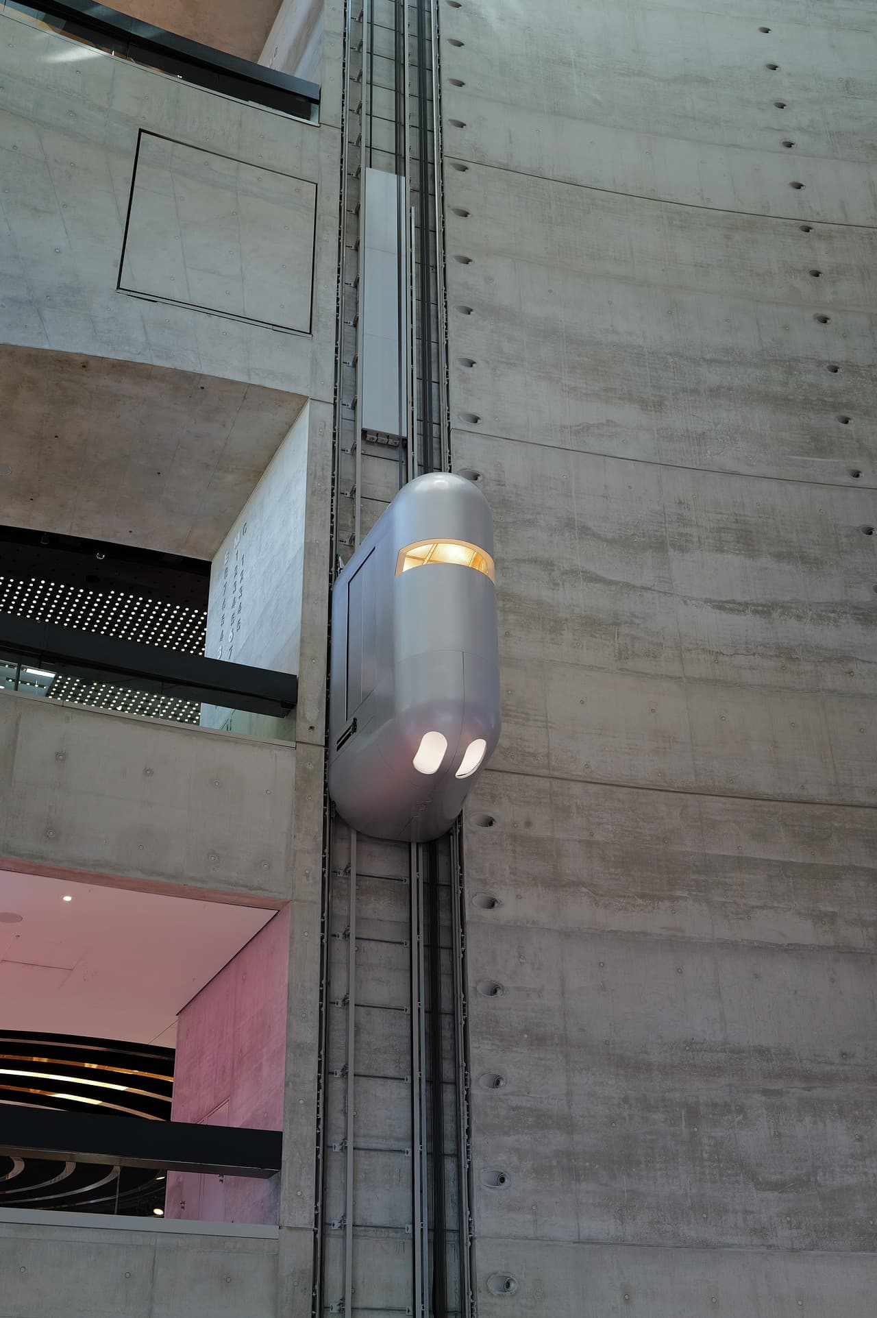 奔驰博物馆一进来就能看到几个很酷的电梯,很像是科幻飞船里的电梯: