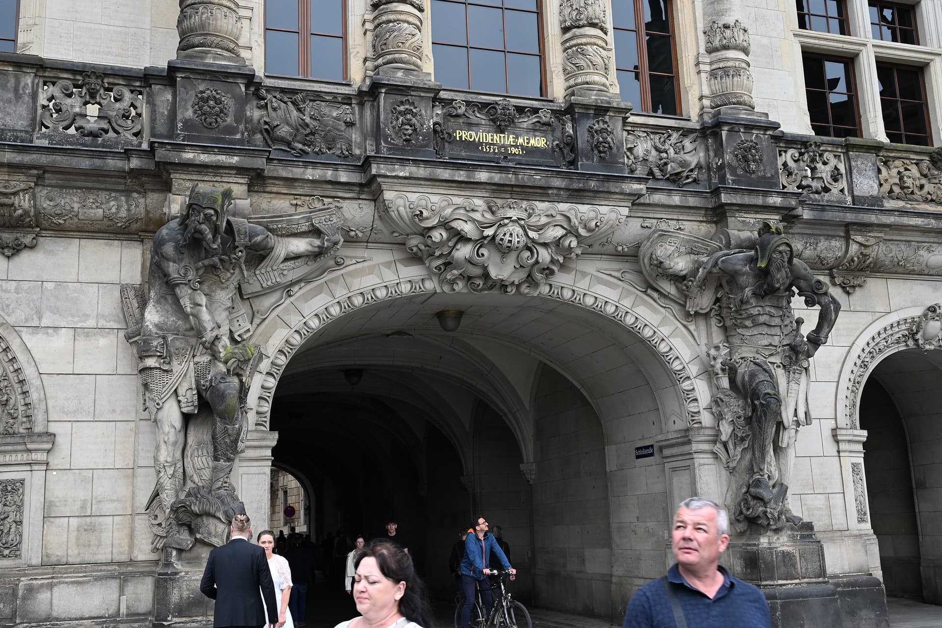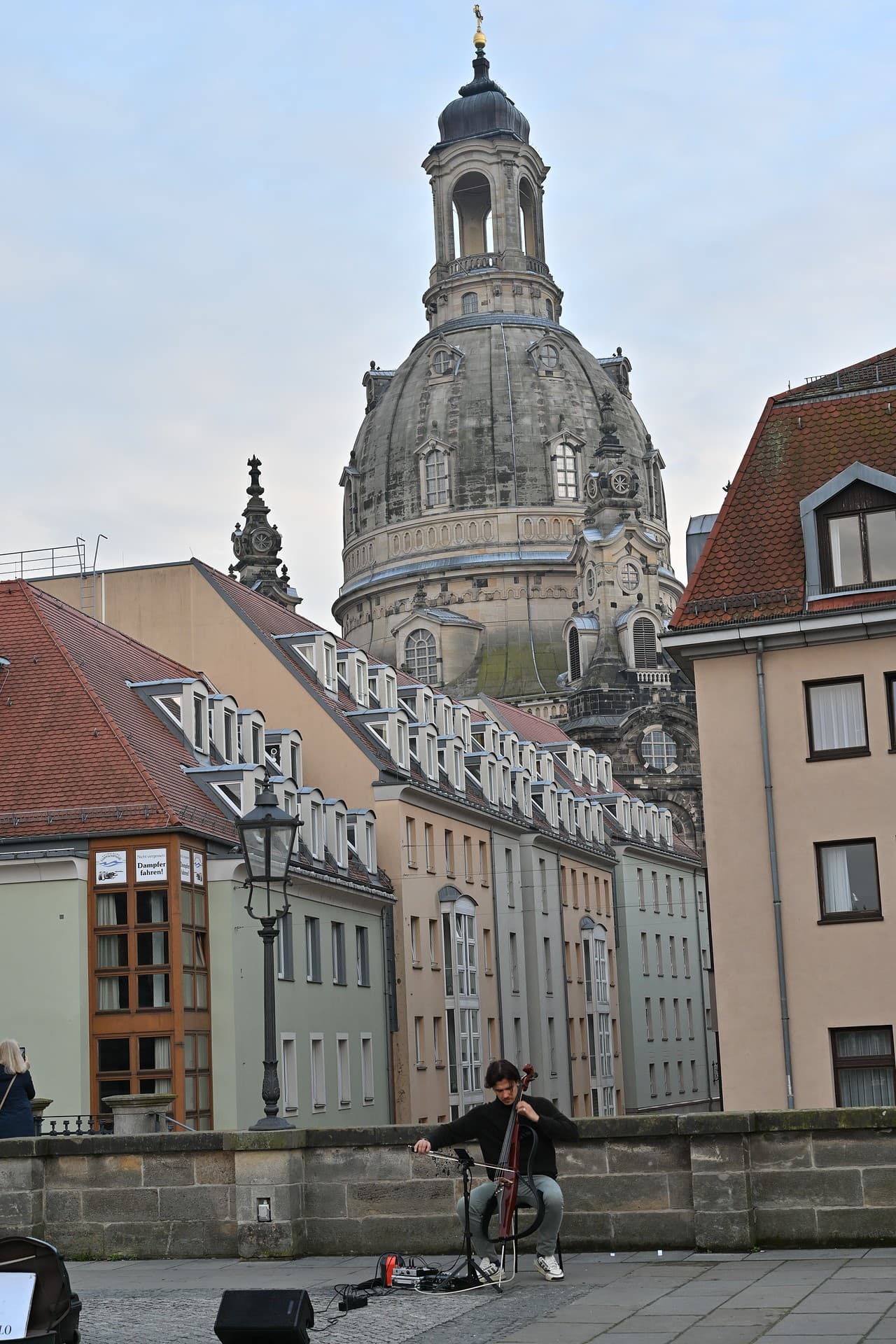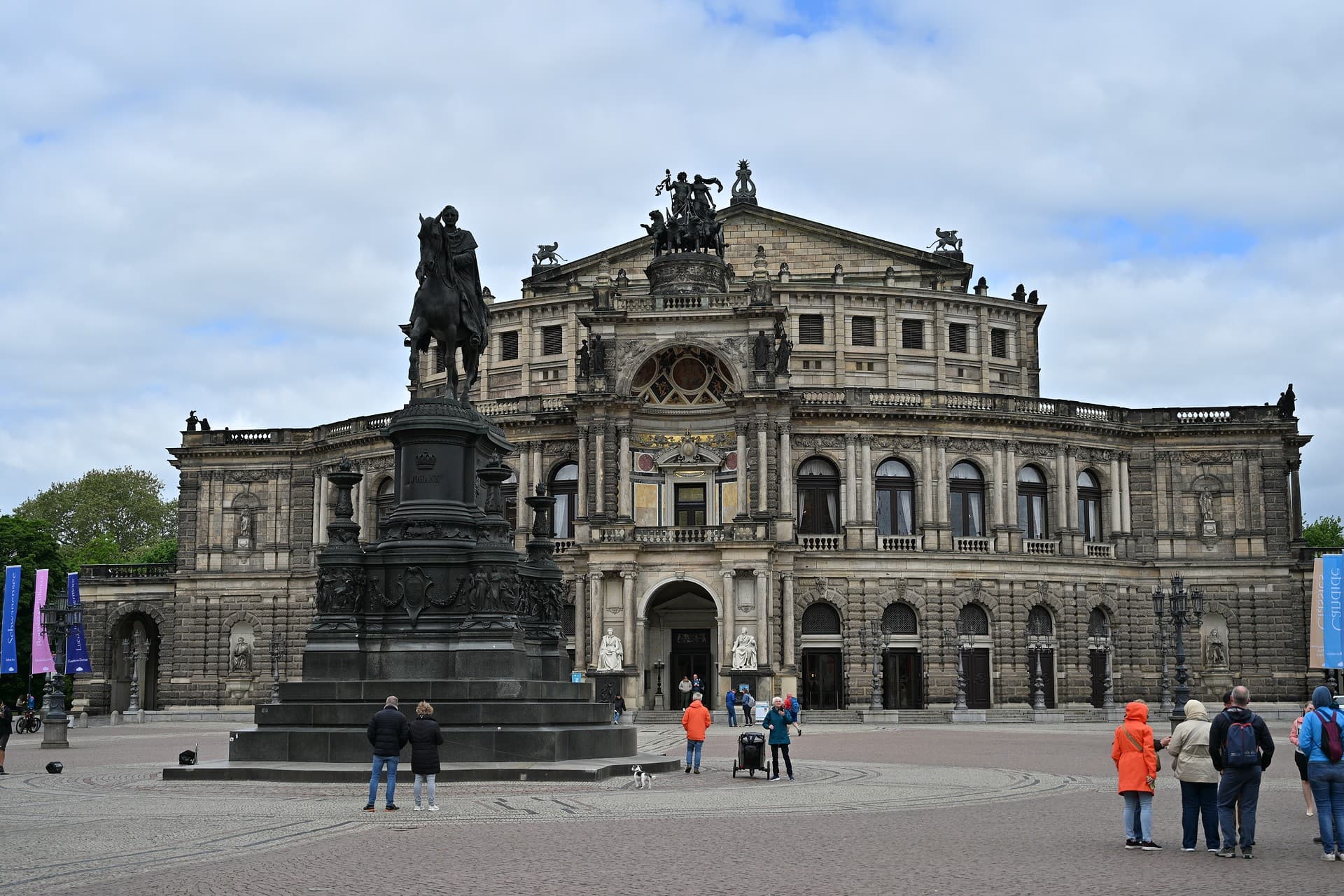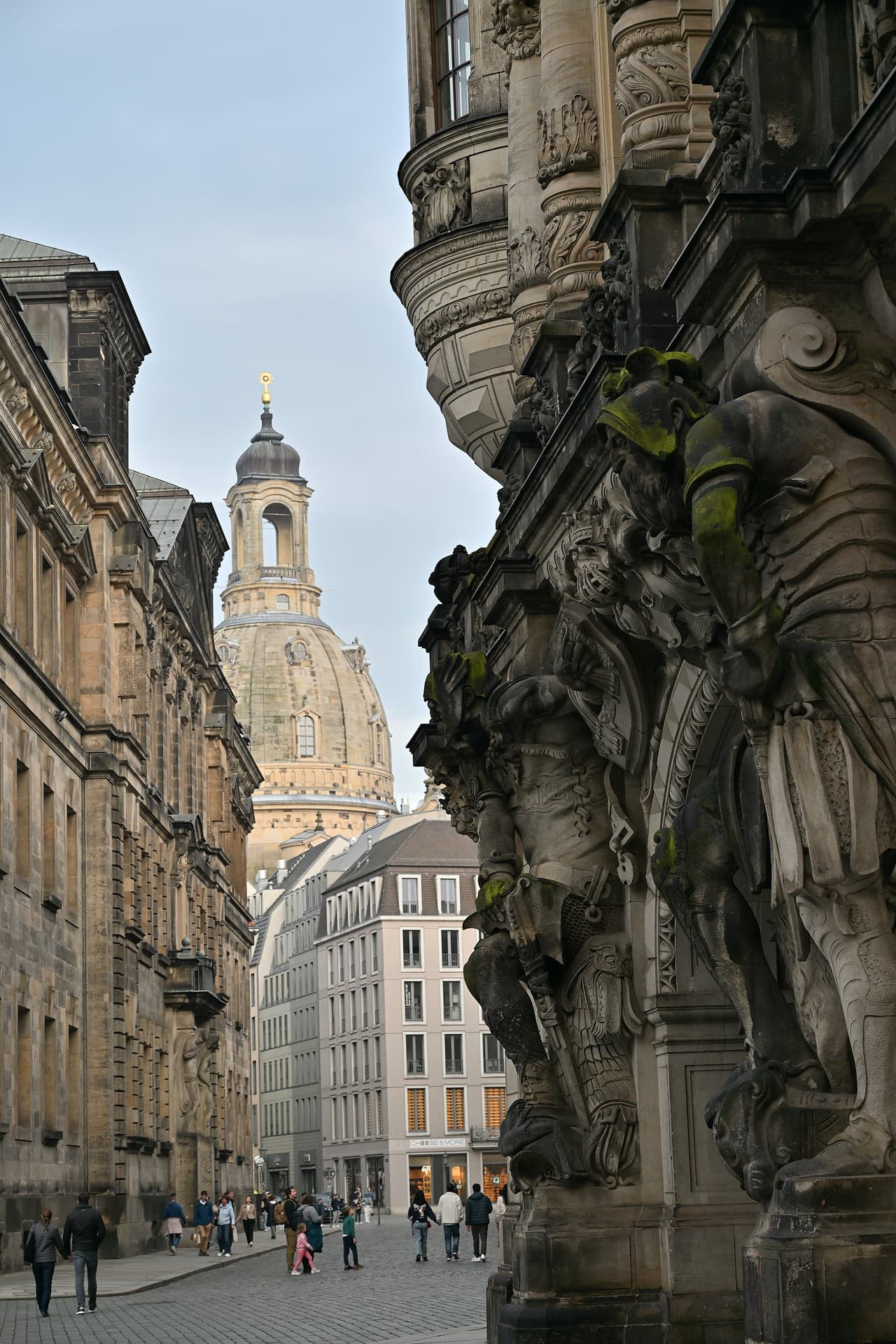 从酒店出门走路十分钟很快就能到德累斯顿王宫。王宫门口的那两个巨人雕像和背后的圣母教堂组成了德累斯顿最佳摄影点之一,很多网红图都是这么来的。唯一的挑战是白天行人特别多,而且还有人在这里摆摊。所以如果想要照那种几乎没人的照片只能早晚来,或者是借助巧妙的借位抓拍来实现效果。