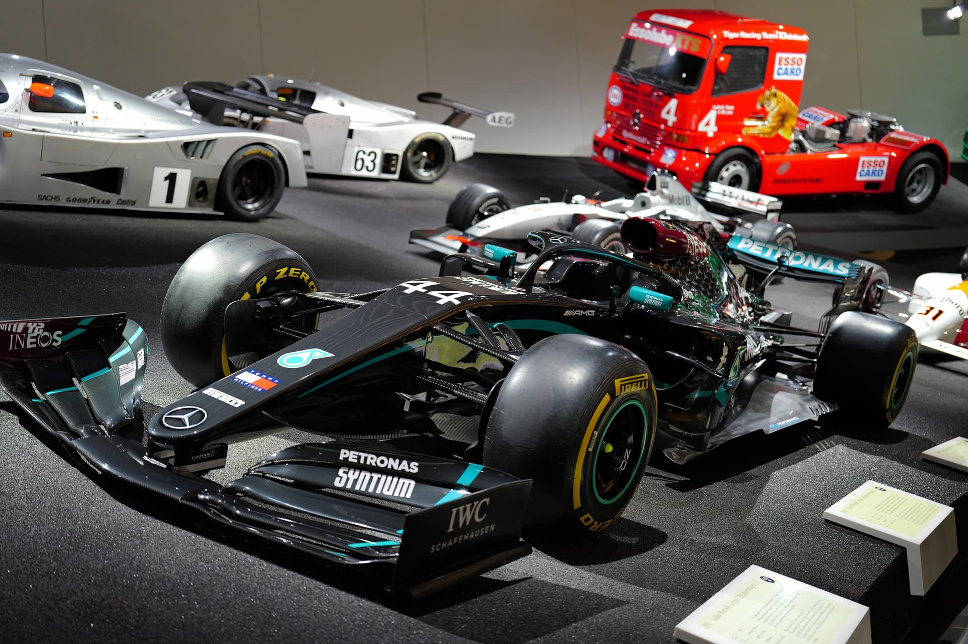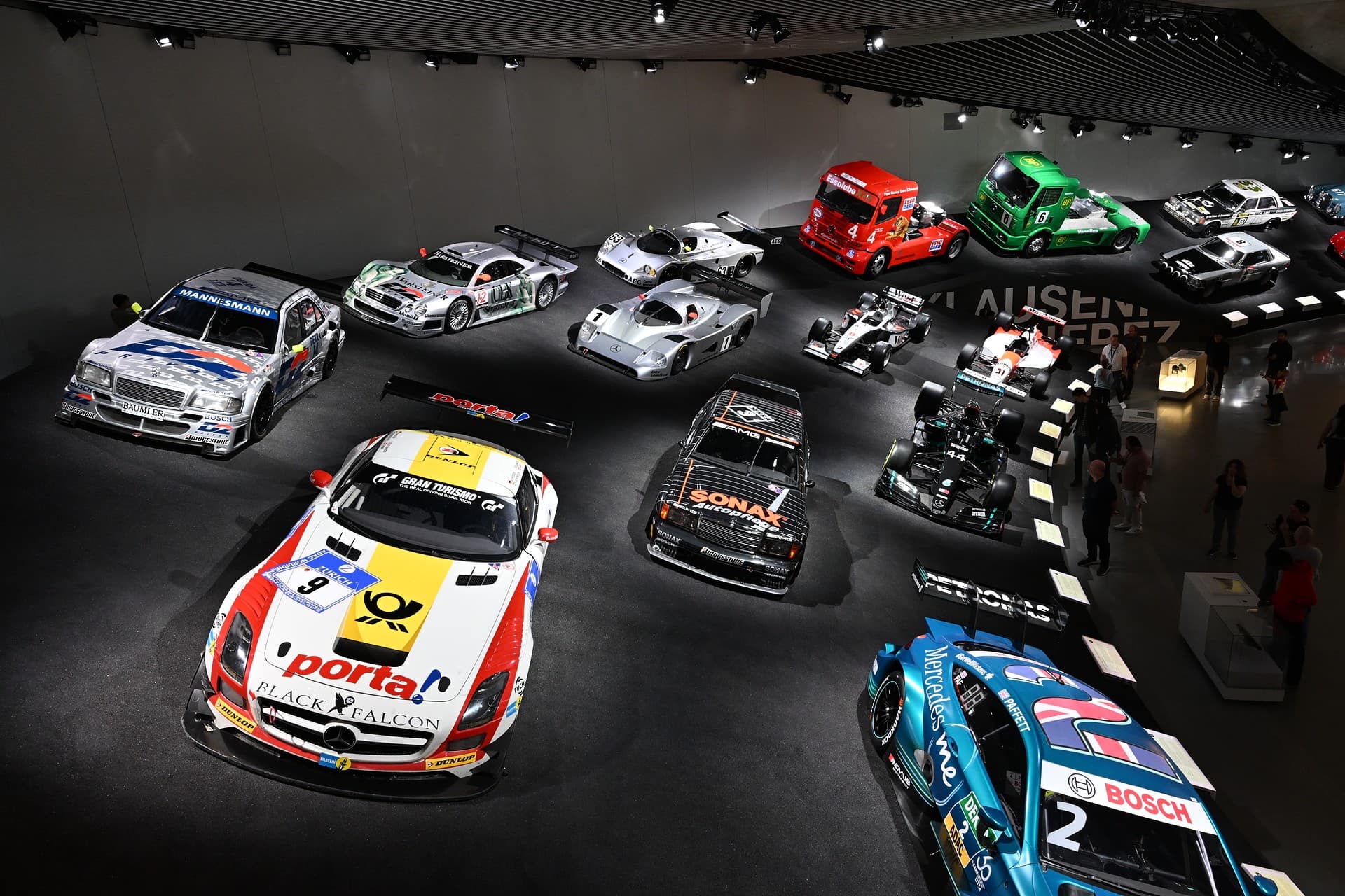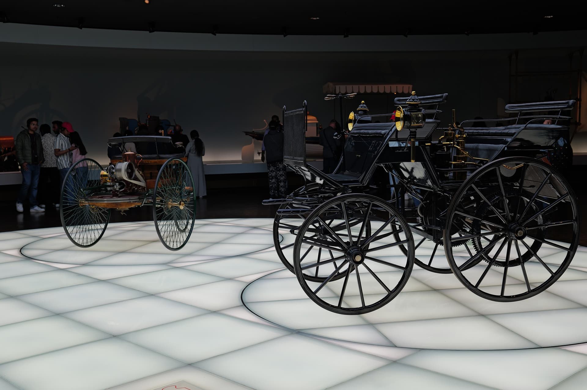 展馆把奔驰的企业史与世界大事并置,强调其在汽车发展史中的地位。坐电梯上顶楼后一路往下逛,可以从第一台发动机一路看到现代车型,完整呈现奔驰百年的沉淀。