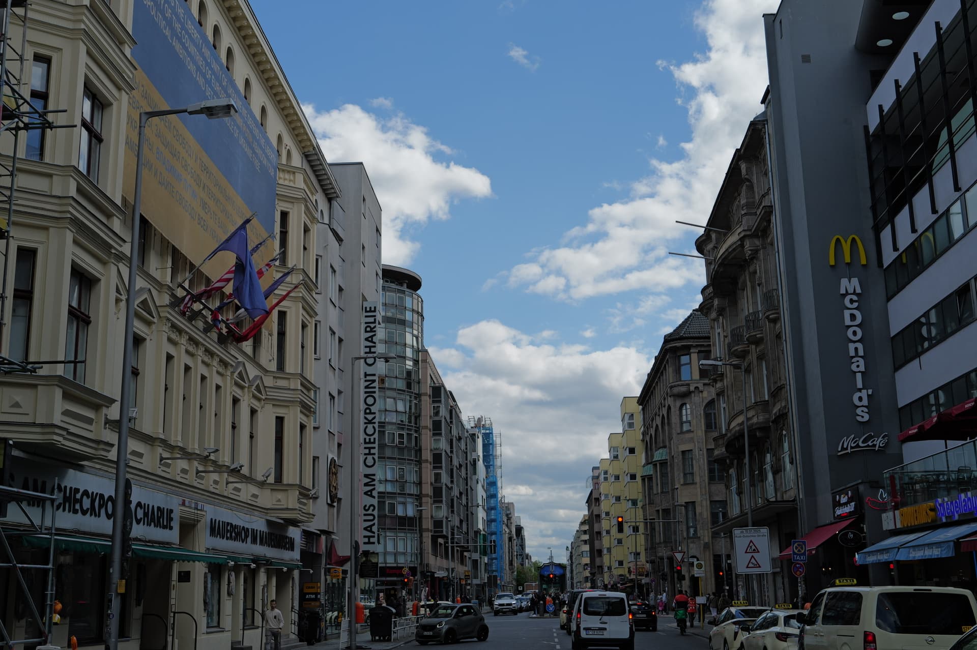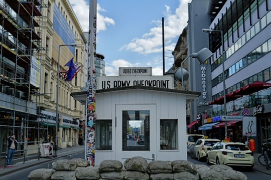 御林广场往南走个十几分钟便来到了历史的裂痕 – 查理检查站。这家检查站是当初东西德之间仅有的几个通道之一。历史上还发生过苏联和盟军在这里对峙的事件,是东西德敏感的神经之一。附近有很长的照片墙讲述东西德和柏林墙的历史,还有一个关于柏林墙的博物馆,但我没有进去看过。