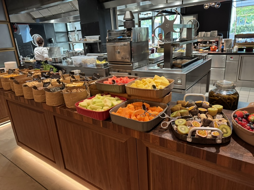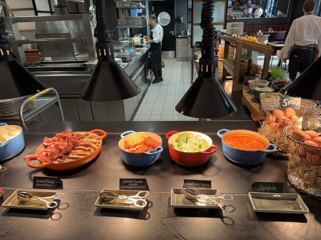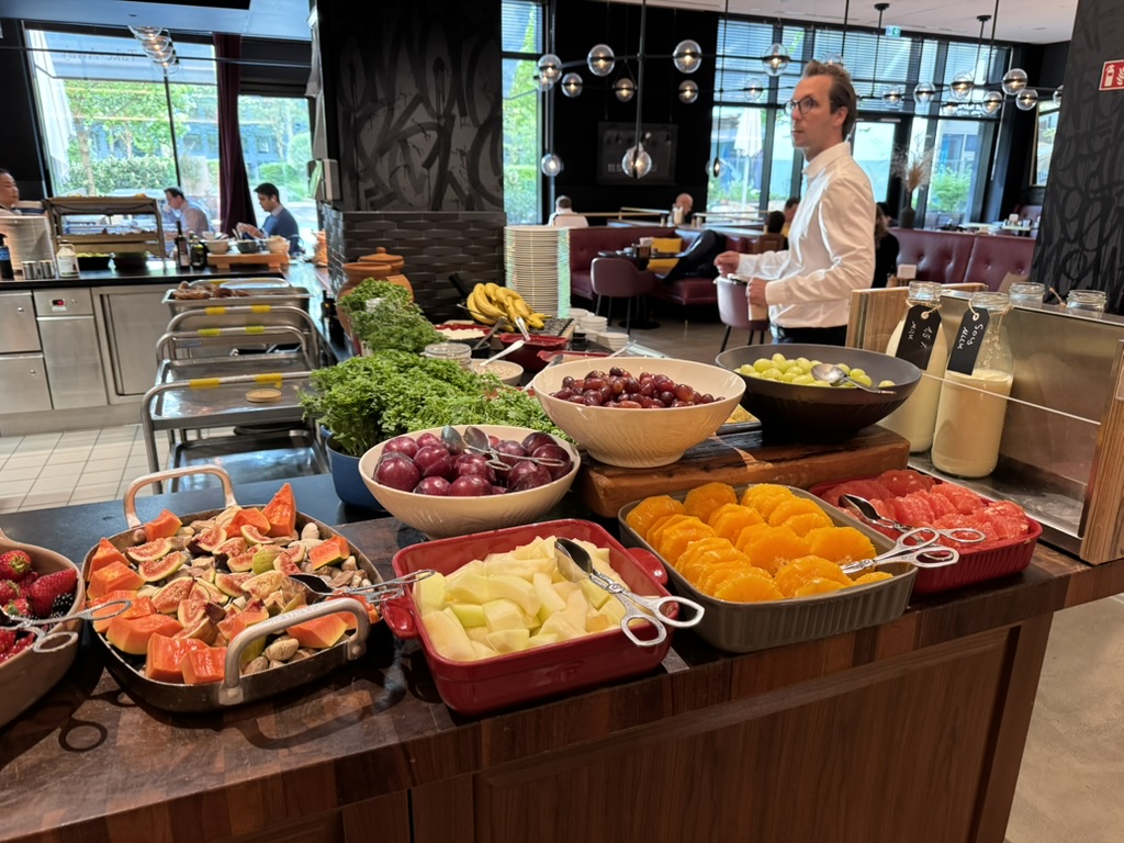楼下的大厅的早餐。种类繁多,一定要试试不同的面包和香肠。还有Muesli,是那种类似overnight oat但是加了新鲜的水果和酸奶,还可以自选加各种坚果和干果,健康又美味,回来后我都开始自制Muesli了。除了自取还可以点各种omelet,benedict等等,手艺也很不错,还能点出花样来。比如benedict可以要求在加上菜单上没有的烟熏三文鱼等等。