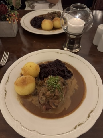 这家餐厅随便点都还不错(反正德国菜来来去去就那么几样)。不过他家的potato dumpling真的惊艳到我了,那是一种软软的土豆球,外面是酥酥的,越往里面越软,最中心几乎变成绵密土豆泥。我第一次发现土豆还能好吃成这样!